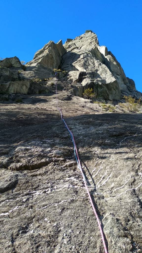 Bella via su roccia ottima e ambiente spettacolare, l’arrampicata è prevalentemente tecnica e di movimento. Via di stampo sicuramente sportivo ma da non sottovalutare nei primi tiri dove le distanze fra le protezioni superano facilmente i 4-5 m necessario un solido 6a. I tiri più impegnativi invece sono sempre chiodati vicini.