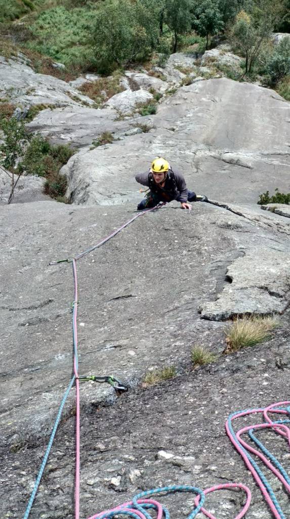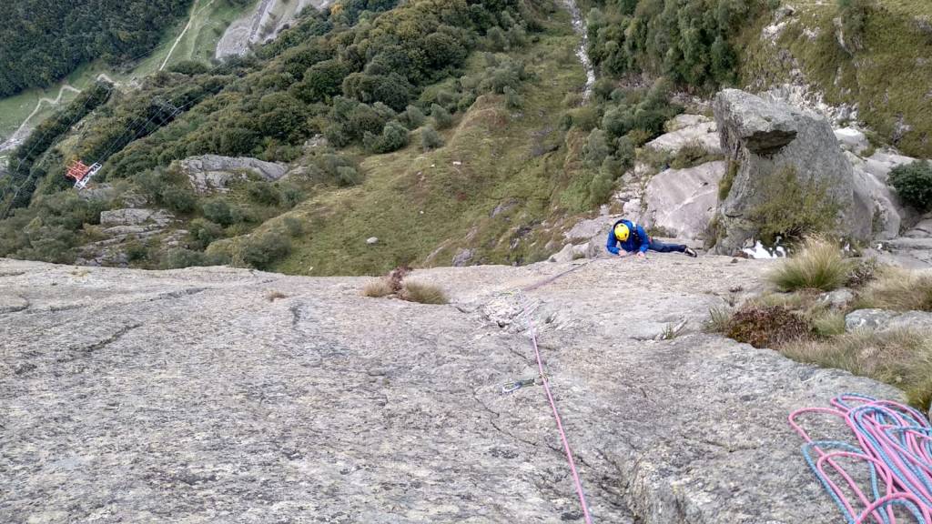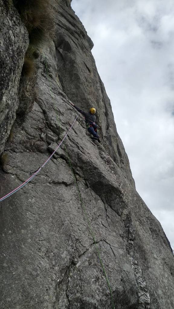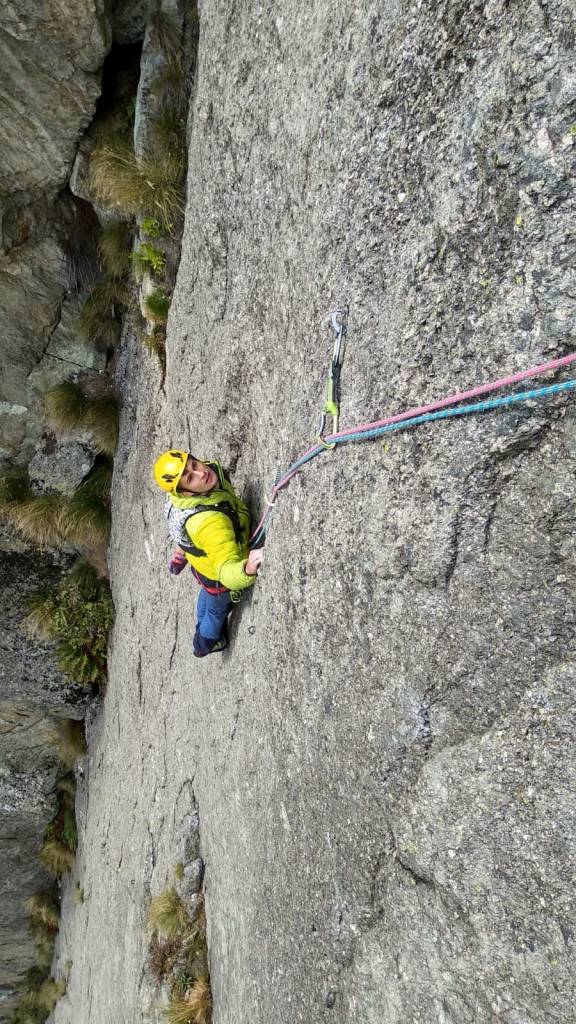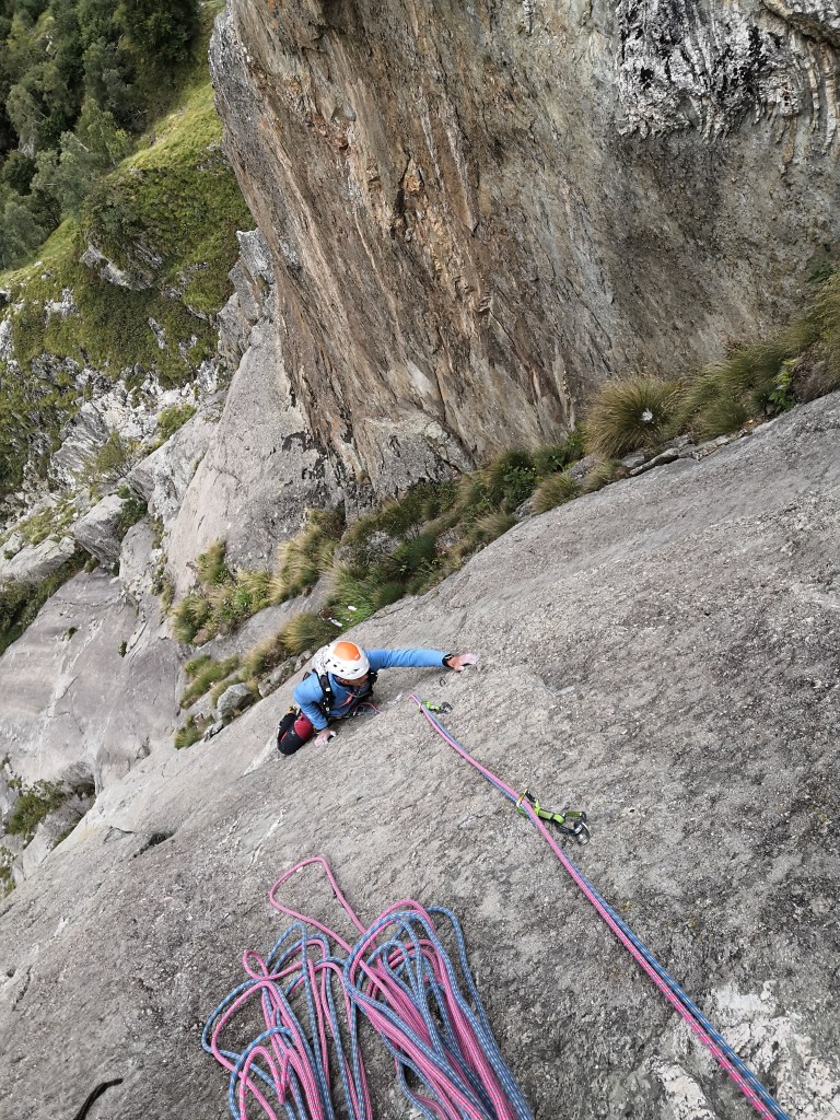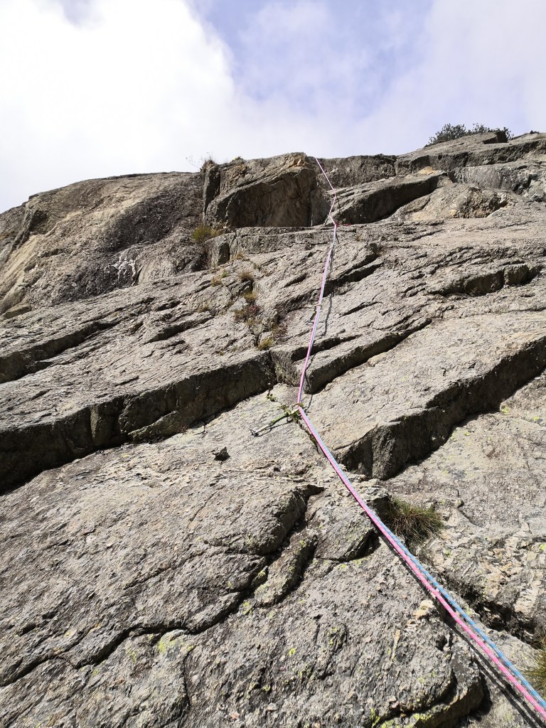 8)Continuare in placca verso sinistra fino a un diedro erboso dove ci si sposta a sinistra e per buone tacche si arriva in sosta. [45m, 6a, 10 fix]