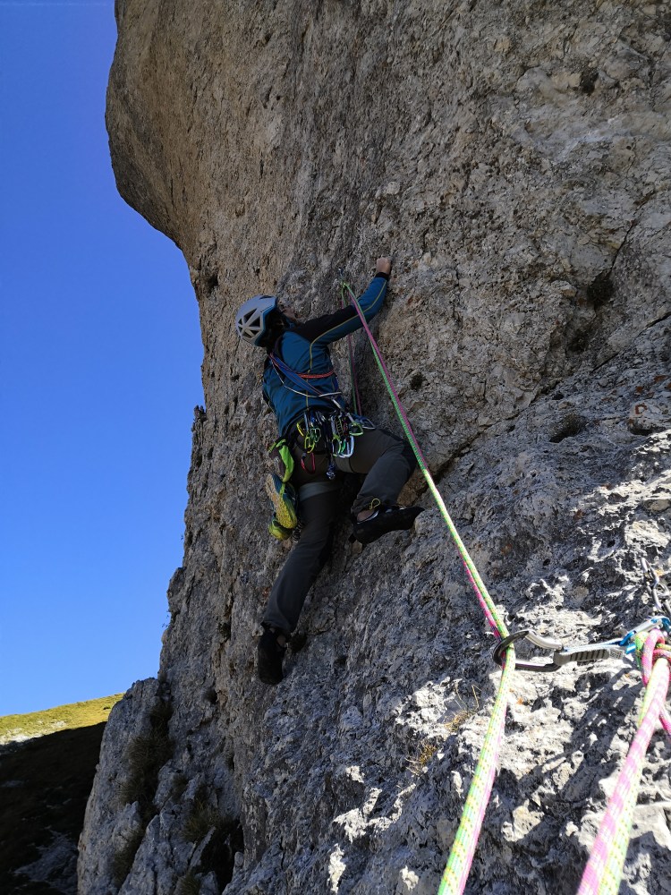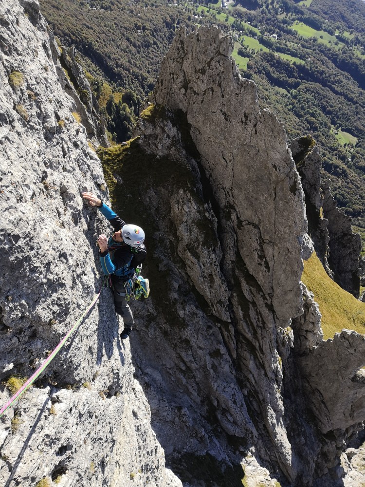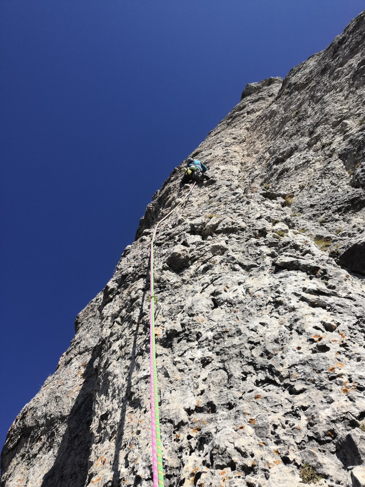 5) Salire dritti sopra la sosta su placca verticale magnifica. Tiro non impegnativo ma con qualche passo che richiede decisione (protezioni sicure ma un po’ più distanti). [40m, 6a 1 passo 6a+, 9 fittoni]