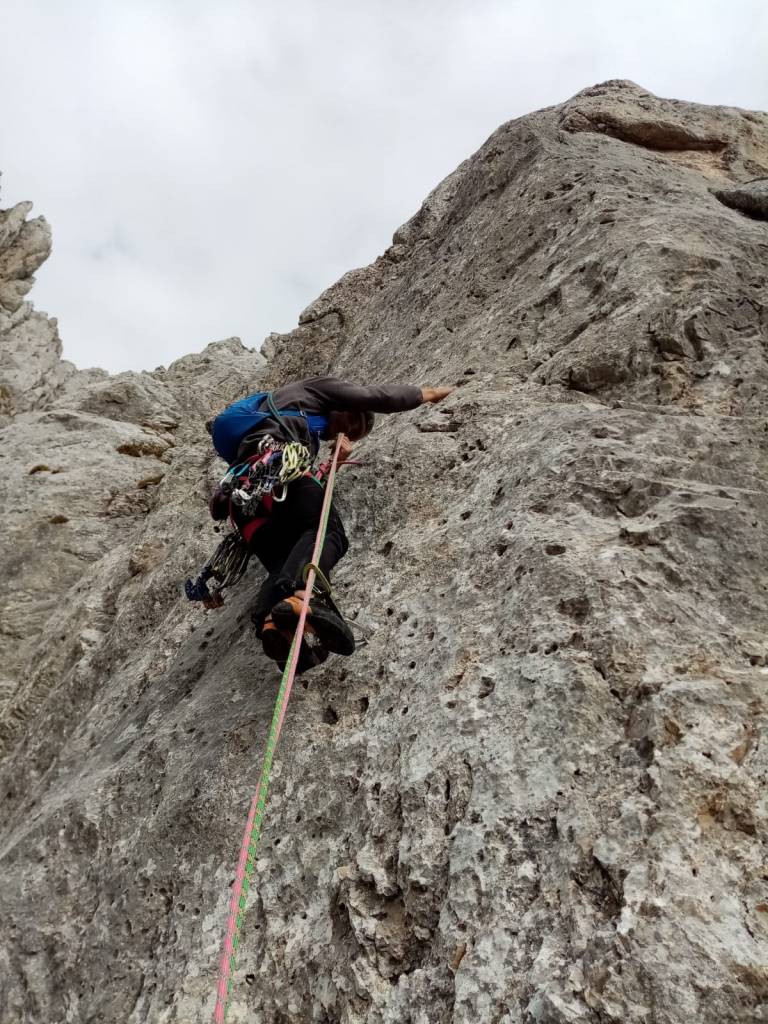 - Salire il bel diedro fessurato sopra la sosta fino a quando si verticalizza e uscirne a destra. Aggirare lo spit verso sinistra e continuare dritti fino a un risalto verticale dopo il quale si trova la sosta (2 spit+cordone+maglia) [5c, 30m]