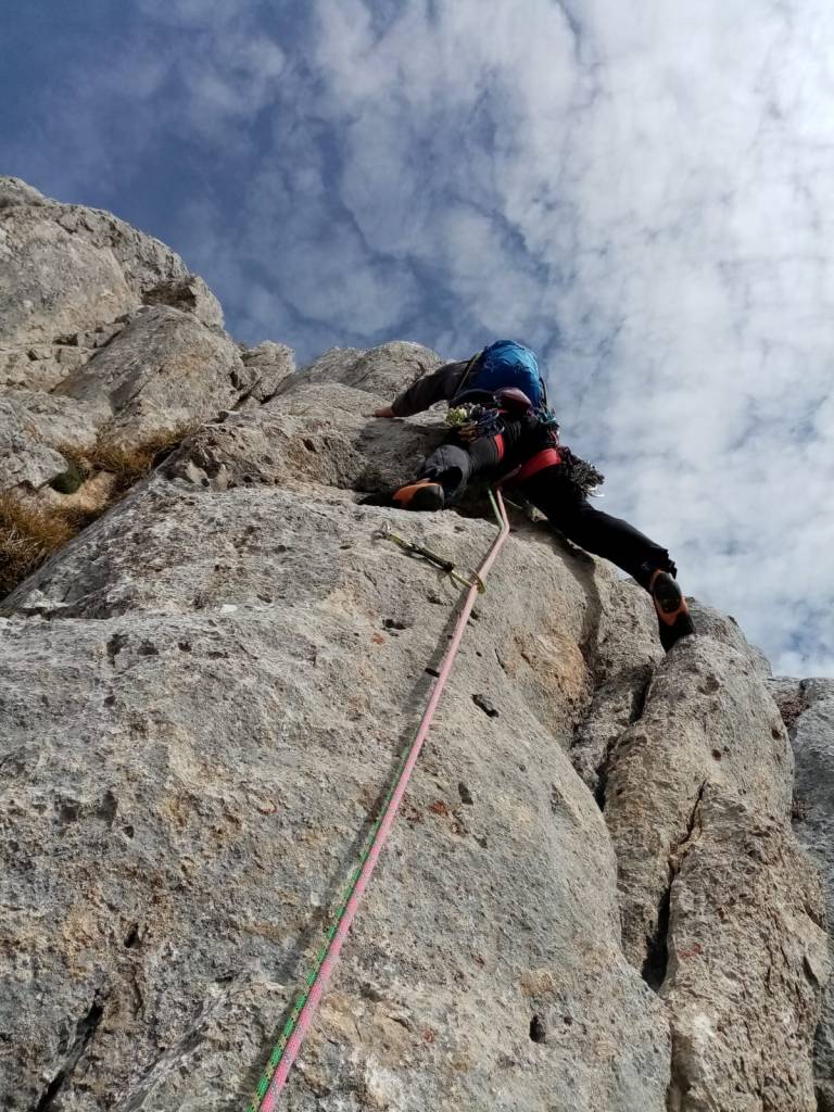 - Salire il diedro a destra della sosta (primo spit alto proteggersi a friend). Percorrere interamente il diedro fino a quando è chiuso da una placca strapiombante traversare a sinistra doppiando lo spigolo (non continuare fino alla placca traversare prima). Spostarsi un paio di metri a sinistra fino allo spit in placca. Salire la placca con un paio di passi in aderenza e uscire su terreno più semplice. Salire dritti superando un saltino verticale e proseguire sulla successiva placca tenendo la sinistra dopo l’ultimo spit. La sosta si trova sotto a un pilastrino di roccia compatta 2 metri a sinistra di una vecchia sosta a chiodi(2 spit+cordone+maglia).[6a, 40m]