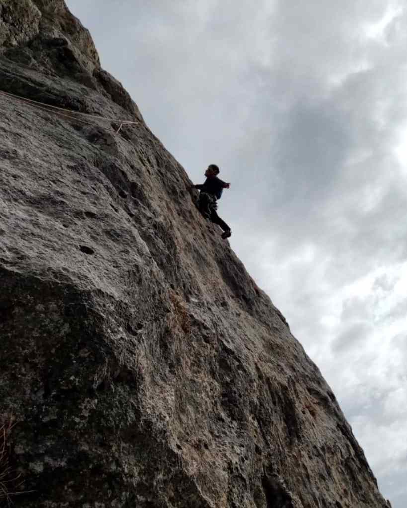 - Salire la placca compatta fino al chiodo da cui ci si sposta leggermente a sinistra per poi salire a delle buone prese. Traversare leggermente a destra fino a prendere la lama che si risale fino a uscirne con passo delicato. Continuare per qualche metro a destra fino ad entrare in un piccolo diedrino (spit) che porta sul terrazzino di sosta(2 spit+cordone). [6b+, 20 m]