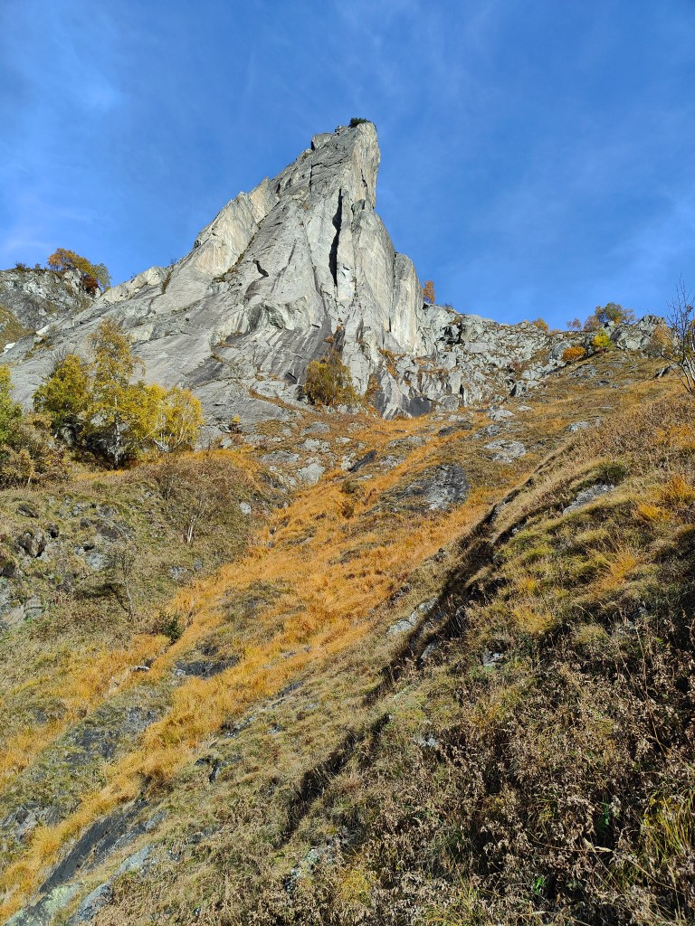 - Salire il camino fino all’intaglio e poi per facile placca si raggiunge la cima del pinnacolo. Sosta a spit con catena e anello di calata. [VI, 40m]