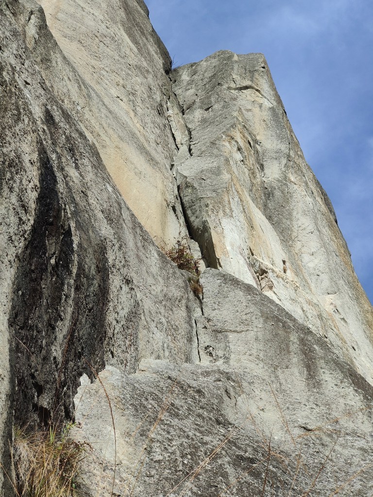 - Salire la fessura sopra la sosta per qualche metro e poi traversare al sistema di fessure sulla destra. Seguire una fessura per qualche metro e poi entrare in un diedro irregolare da cui si esce sfruttando la fessura sul fondo e una buona presa sulla placca di destra. Una volta usciti continuare per qualche metro su terreno facile fino alla sosta posta alla base di una placca su una cengia erbosa (2 golfari). [VII-, 40m]