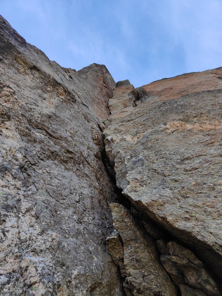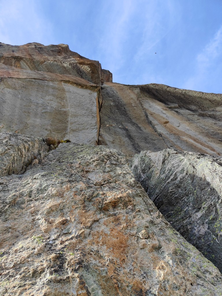 - Seguire la lama sopra la sosta verso destra fino ad arrivare sotto a un diedro “a V” che si supera con un paio di passi faticosi (attenzione a non tirare il masso incastrato alla base del diedro si muove!!). Una volta usciti dal diedro continuare su fessure parallele con arrampicata entusiasmante fino a quando lasciano lo spazio a una fessura più larga e fuori misura. Seguirla fino a una grossa scaglia incastrata sulla sinistra. A questo punto uscire in placca e con delle ottime prese si arriva in sosta (2 golfari). [VII, 45 m]