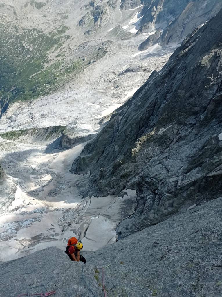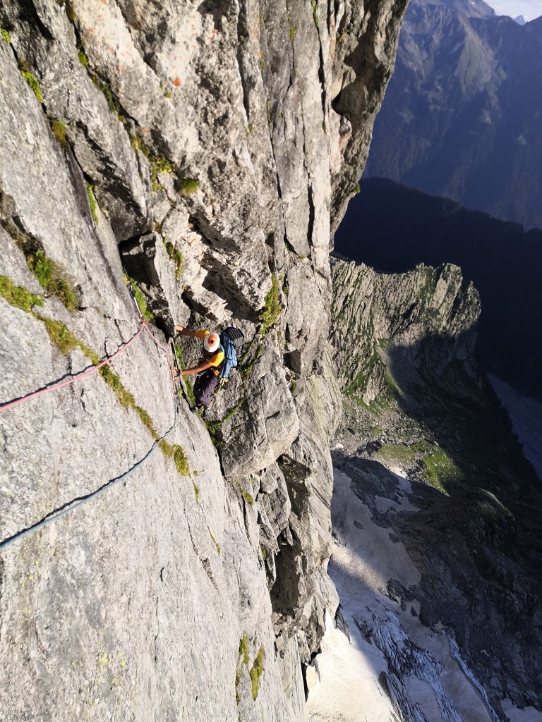 Circondato da Cengalo e Badile mi sento così piccolo ma anche così pieno di energia da avere l’impressione di poter sollevare tutta la muraglia del Cengalo se solo fosse abbastanza vicina, oggi neanche 3000 metri di parete potrebbero fermarmi. Partiamo con calma ma tenendo un ritmo costante alternandoci in quasi tutti i tiri tranne qualche breve zona in cui procediamo in conserva. Ci fermiamo solo una volta arrivati alla cengia centrale per mangiare qualcosa per poi ripartire subito sul tiro chiave, un diedro verticale molto bello e continuo (noi abbiamo sbagliato continuando fino al tetto e traversando troppo tardi a destra su roccia un po’ delicata). La seconda parte della via è un po’ più continua e verticale, particolarmente impegnativi sono i tiri nei camini dove il grado non rispecchia la fatica che si fa (soprattutto con zaini molto grossi). Una volta usciti in cresta la vista che si apre è spettacolare e l’esposizione notevole, con una serie di facili tiri in conserva seguendo più o meno il filo dello spigolo si arriva in vetta (circa 1/1:30 h). La soddisfazione in vetta viene subito diluita dalla realizzazione che mancano ancora 6 ore buone di discesa. Con circa 5/6 calate siamo alla base della parete Sud e in circa mezz’ora al Rifugio Gianetti dove ricarico mente e fisico con l’immancabile coca cola di fine gita. Finita la cerimonia coca cola ci avviamo controvoglia verso i bagni del Masino e dopo 2/3 ore interminabili arriviamo alla macchina. Che dire… Grande avventura su una grande parete con il mitico Dario come socio, tutto perfetto! Si conclude col botto con il kebab che ci siamo concessi nella “bellissima città” di Lecco a mezzanotte circa.