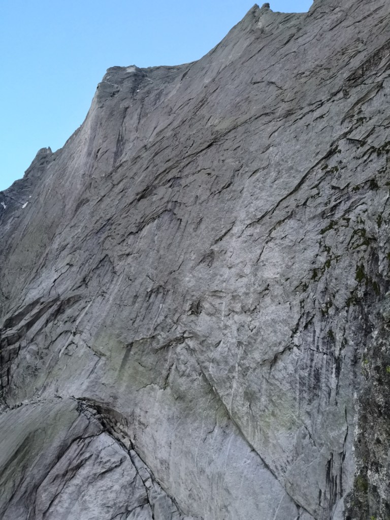 Con questa salita inizia il mio piccolo progetto “6 sempre a Nord”, l’idea è quella di salire le sei grandi Nord delle alpi seguendo le prime vie tracciate sulla parete ripercorrendo le impronte dei grandi alpinisti del passato. Inizialmente pensavamo di cominciare con la nord del Petit Dru ma dopo varie ricerche sulle condizioni e intimoriti dalla ignobile fama della parete abbiamo preferito rimandare alla primavera quando c’è più freddo e le rocce tendono a caderti con meno frequenza in testa. La scelta quindi ricade sulla Nord del Badile e la mitica via Cassin che, con i suoi oltre 1000 m di sviluppo, taglia in diagonale tutta l’immensa parete NE seguendo logiche fessure e facili traversi in placca dove queste si interrompono. Normalmente per affrontare questa via si sale dal lato svizzero seguendo il sentiero che porta al rifugio Sasc Fura e poi, a seconda delle preferenze ( o dell’etica di salita), si pernotta al rifugio o fuori in tenda/bivacco. Come da tradizione decidiamo di fare gli alternativi e saliamo dal lato italiano con l’idea di concludere il tutto in due giorni evitando un’ulteriore notte fuori (necessaria a chi parte dalla svizzera per poi ritornare alla macchina dato che la discesa è sul lato italiano). Ovviamente un motivo c’è se quasi nessuno sceglie questa opzione e il motivo sono le circa 8/9 ore di cammino che servono per arrivare al Sasc Fura partendo dai bagni del Masino. Come se non bastasse abbiamo deciso di non usufruire del rifugio per dormire e quindi ci portiamo dietro due zaini… Pesantini! Dopo circa 8 ore di sofferenza e continue ricerche dei bolli sfuggenti sul “sentiero” arriviamo finalmente al rifugio svizzero dove mangiamo i nostri classici tortellini emiliani e ci imboschiamo come dei fuorilegge in un prato incolto 60 m sotto al rifugio allestendo lì il nostro campo base. La notte passa velocemente grazie a una temperatura mite e una stellata spettacolare senza dimenticarsi del mio materassino di circa un kg e mezzo ma d’altronde “la comodità prima di tutto”. La sveglia suona presto come al solito accompagnata da qualche imprecazione e pensiero sulla parete che stiamo per attaccare. Con circa 2/2:30 h di avvicinamento ci portiamo sulla cengia alla base della via.