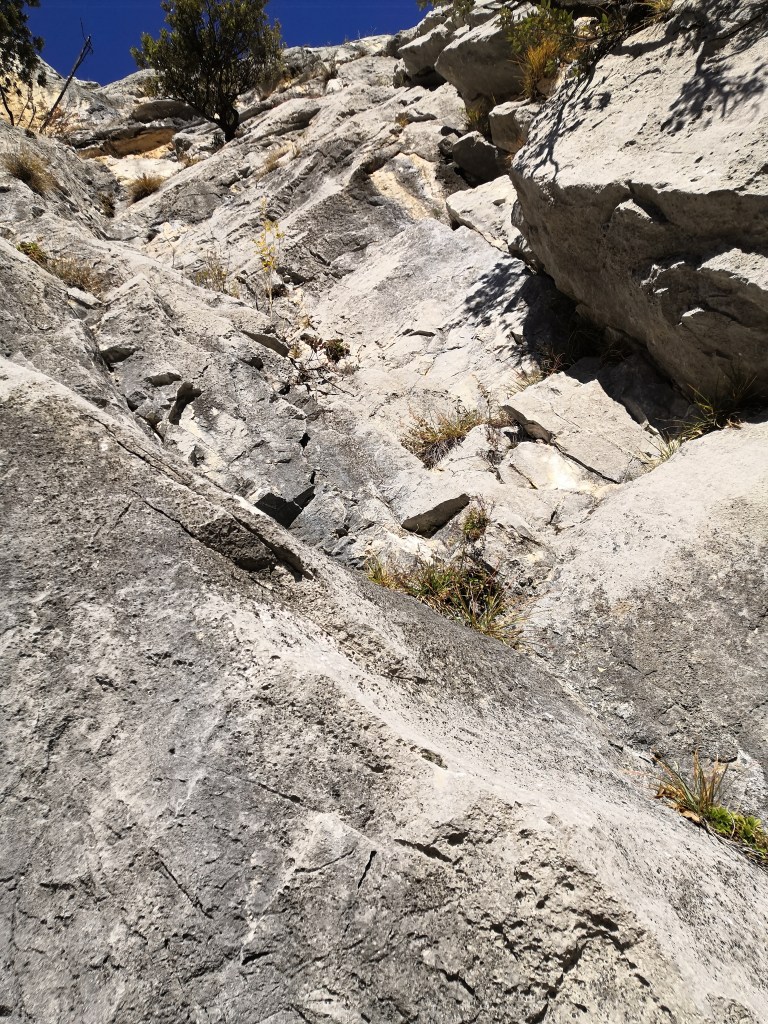 - Superare la prima sezione faticosa ed entrare nel successivo diedro. Alla fine del diedro traversare un paio di metri a sinistra per poi salire in placca stando leggermente a sinistra fino a un alberello da dove si prosegue in verticale fino alla sosta su 3 chiodi.[VII+, 30 m]