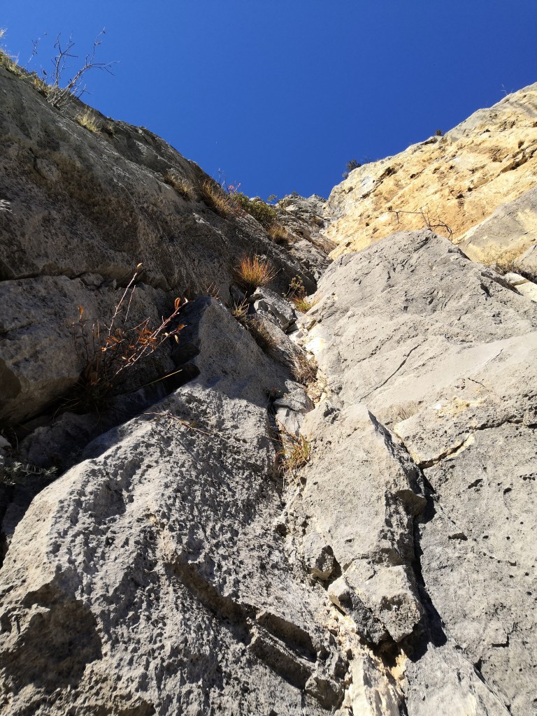 - Salire il diedro a destra della sosta fino alla sua fine dove si traversa su terreno rotto verso sinistra. Sosta su albero.[V+, 25m]