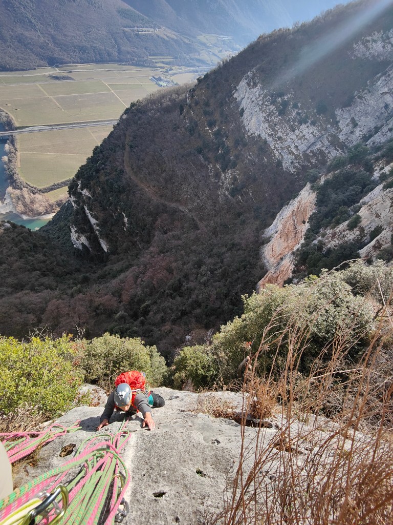 - Salire il muro leggermente strapiombante sopra la sosta fin sotto ad uno strapiombino che si supera con passo deciso verso destra. Si continua per diedrino fino a quando non conviene spostarsi a destra in placca per raggiungere la sosta (2 spit+catena). Tiro molto bello e continuo! [6c, 30m]