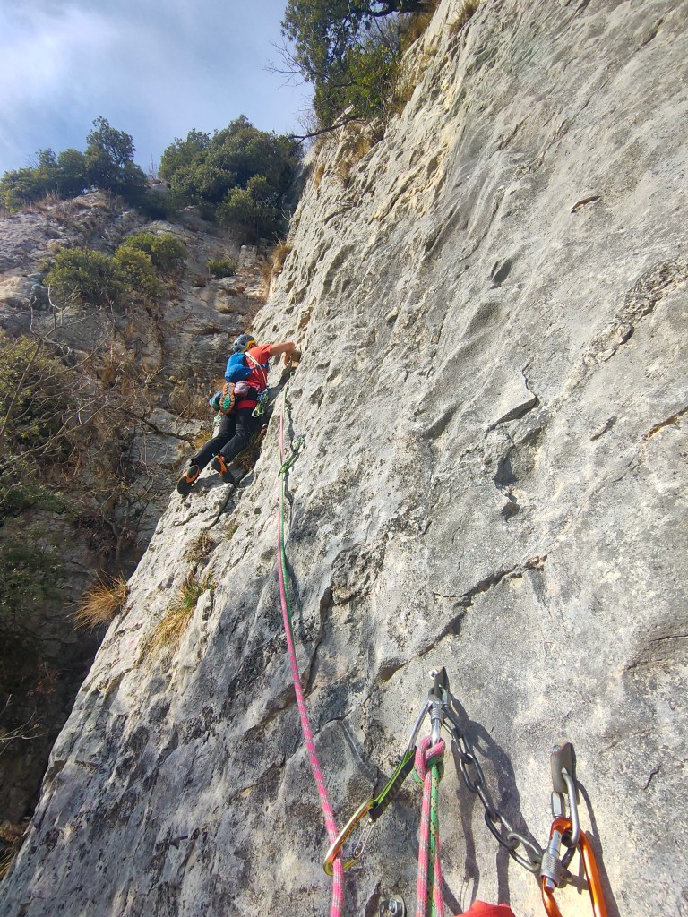 - Spostarsi un paio di metri a sinistra e salire un diedrino con prese generose (ignorare gli spit a sinistra). Salire dritti e superare la successiva placca fino ad arrivare sotto ad uno strapiombino ammanigliato. Superarlo e continuare obliquando leggermente a destra. Superare l’ultima placca verticale a buchi e lame fino ad arrivare nel bosco dove si sosta su pianta. [6a, 40m]