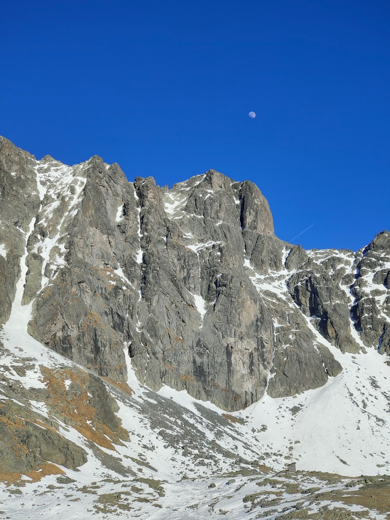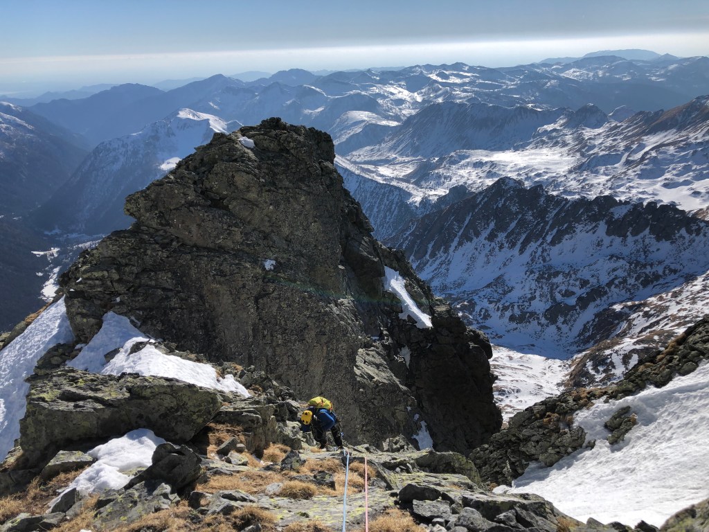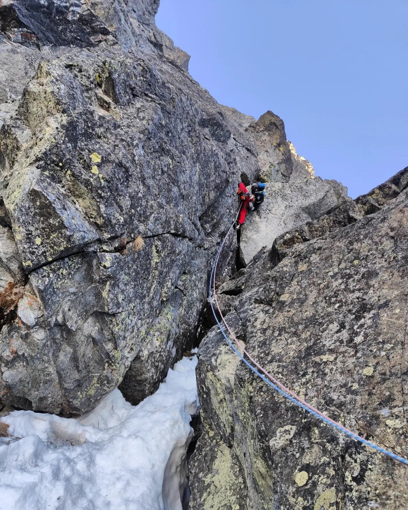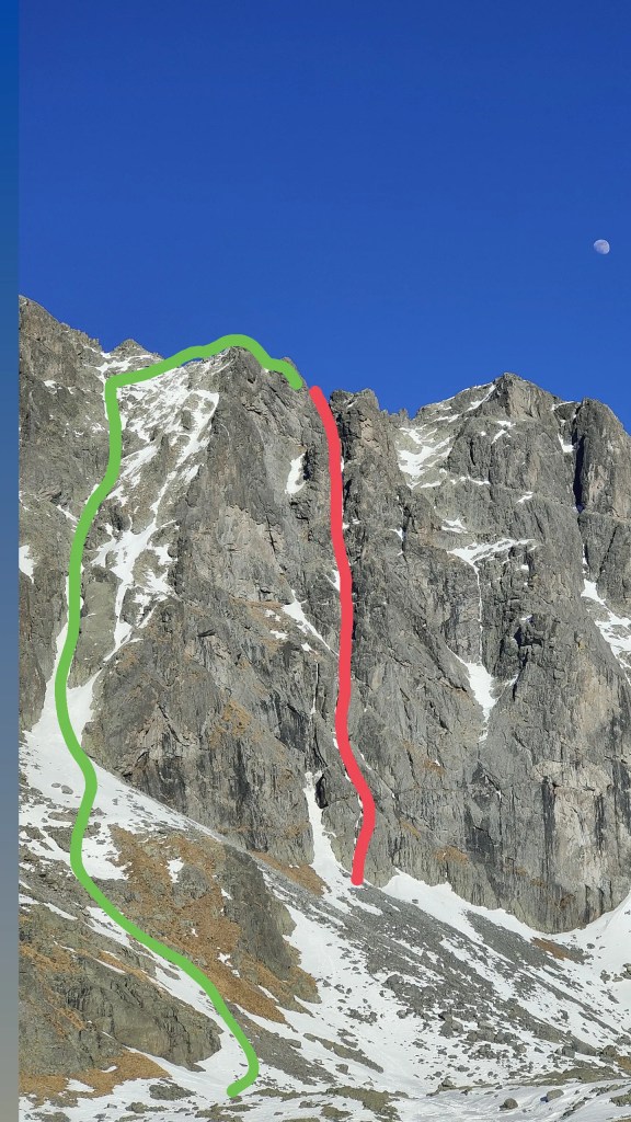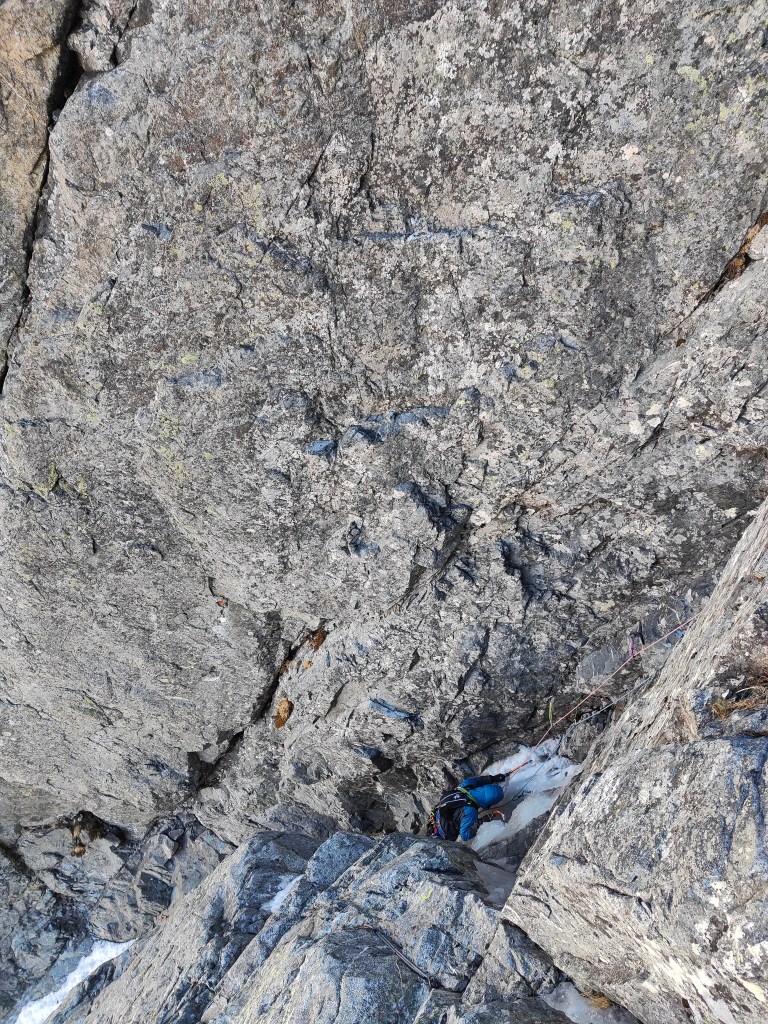 - Qui la via originale sale la placca appoggiata a sinistra (dopo i primi facili metri su neve). Noi abbiamo salito il camino a destra che purtroppo era completamente secco e decisamente scomodo con lo zaino. Tiro poco proteggibile e non banale (si piazza un buon friend 1 a metà del camino in una fessura). Usciti dal camino spostarsi a sinistra fino alla sosta(2spit+anelli). [M5+/6, 50m]