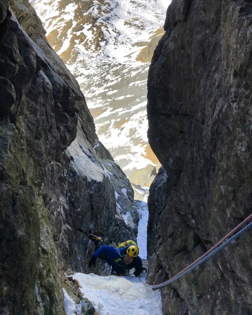 - Salire il camino/goulotte incassato a destra prima facile e poi man mano sempre più verticale. Alla fine del tratto verticale uscire dritti per canale più facile ignorando una sosta a spit che si vede a destra. Continuare invece dritti fino alla sosta posta a sinistra del camino successivo. Abbiamo trovato questo tiro estremamente povero di ghiaccio probabilmente se ben ghiacciato è un “banale” muro ghiacciato, in ogni caso anche quando secco si protegge bene a friend. [M5+/WI4, 55m]
