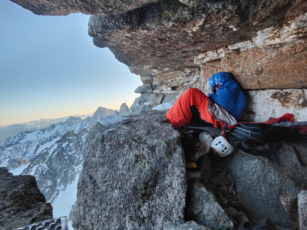 Sul tiro successivo sbagliamo di nuovo via andandoci ad infilare su un muro fessurato verticale veramente complesso e impegnativo. Tuttavia nuovamente riesco con un po’ di fortuna a ritrovare la via che ora risale delle lame fisiche e faticose ma ben proteggibili che con due lunghi tiri ci portano a una grossa cengia detritica da cui partono le ultime 2/3 lunghezze per arrivare alla “breccia di quarzo” dove abbiamo intenzione di bivaccare nuovamente. Arriviamo alla breccia verso l’una di notte sopraffatti da stanchezza e disidratazione che ormai iniziano a mostrare evidenti segni sul fisico. Ancora una volta ci corichiamo su quei pochi metri di roccia che sono stati strappati dalla verticalità della parete e ci addormentiamo immaginandoci già in cima il giorno dopo a goderci il sole che ormai da due giorni ci è quasi del tutto sconosciuto.