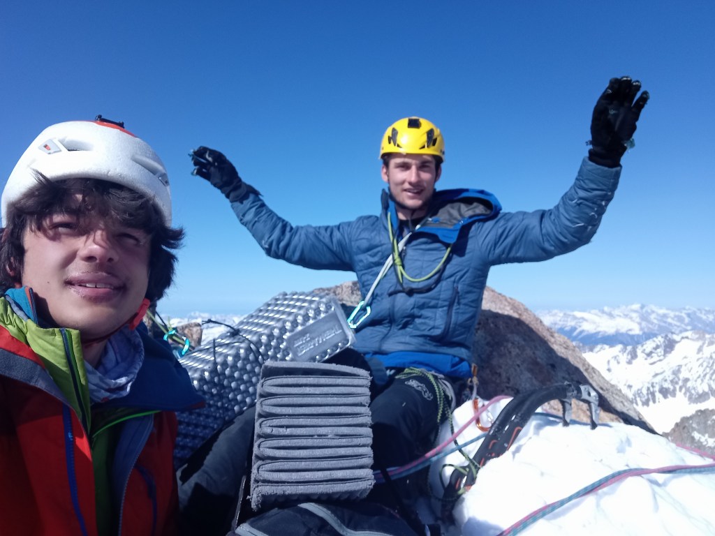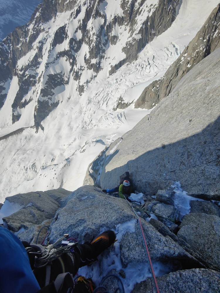 Il giorno seguente in realtà si rivelerà tutt’altro che una passeggiata, le relazioni in nostro possesso infatti descrivevano la salita solo fino alla breccia lasciando i tiri successivi all’immaginazione dei poveri ripetitori. Vedendo che nessuno descriveva i tiri finali avevo dato per scontato che fossero facili e logici, questa purtroppo si rivelerà essere solo una mia povera illusione. Una volta superata la breccia infatti ci troviamo dispersi in un mare di granito e neve dove soste su chiodi e cordoni spuntano da ogni angolo. Dopo quattro tiri decidiamo di tornare indietro e in qualche modo riusciamo a trovare un percorso che ci porta fino in cima. Arriviamo in cima al Petit Dru con un ultimo tiro in conserva di circa 120 m, lo spettacolo che si manifesta davanti ai nostri occhi fra nord delle Grand Jorasses, Dente del Gigante e Monte bianco quasi mi fa dimenticare che è tardi e bisogna affrettarsi il più possibile a scendere prima che faccia buio. Senza perdere troppo tempo quindi ci dirigiamo alla breccia fra i due Dru e iniziamo le calate infinite che ci riporteranno alla base dopo 5 ore non senza un inquietante incastro di corda a metà del Couloir che fortunatamente riusciamo a risolvere tirando la corda incastrata come dei muli da soma. Lentamente scendiamo fino al punto dove avevamo bivaccato il primo giorno e decidiamo di fermarci per sciogliere un po’ di neve e idratarci. Finita la breve pausa ripartiamo alla volta della stazione dei Grand Montets dove arriveremo dopo due ore di pura sofferenza e allucinazioni causate dalla sete che mi faceva vedere conigli danzanti nelle macchie del granito e sentire rumori immaginari a Dario.