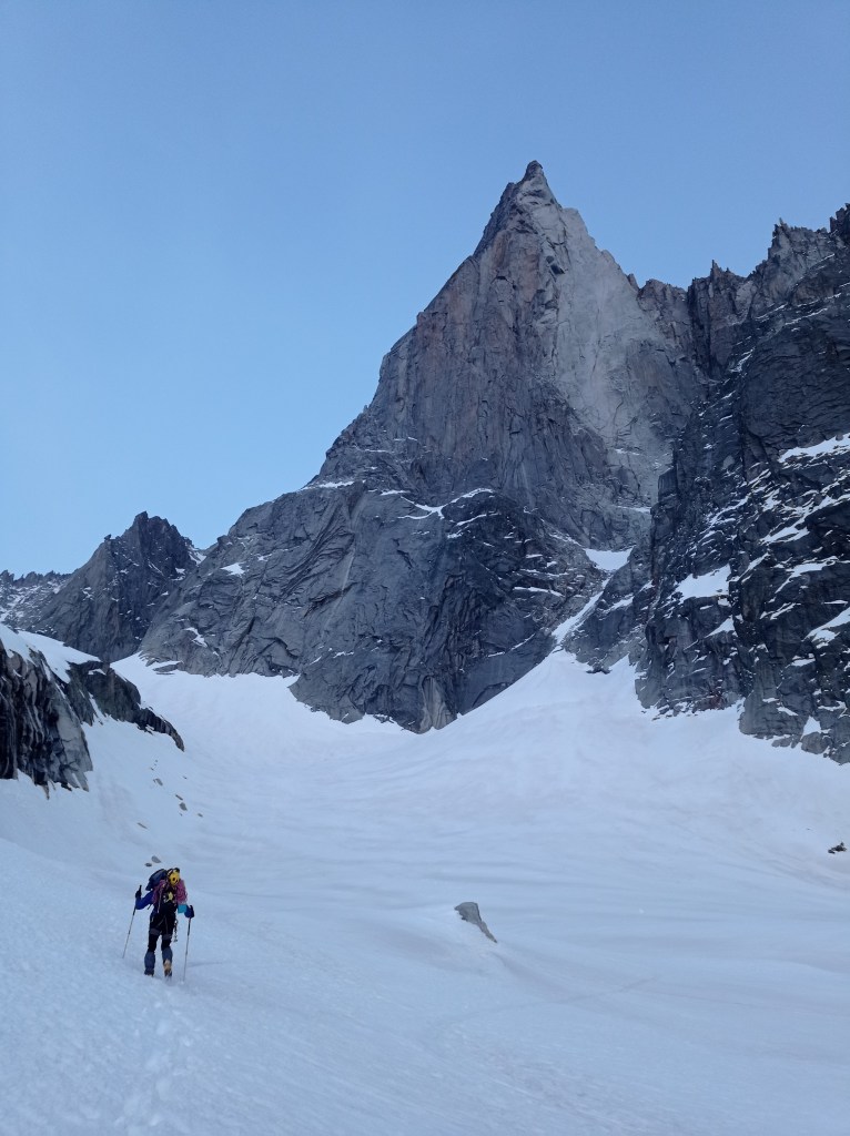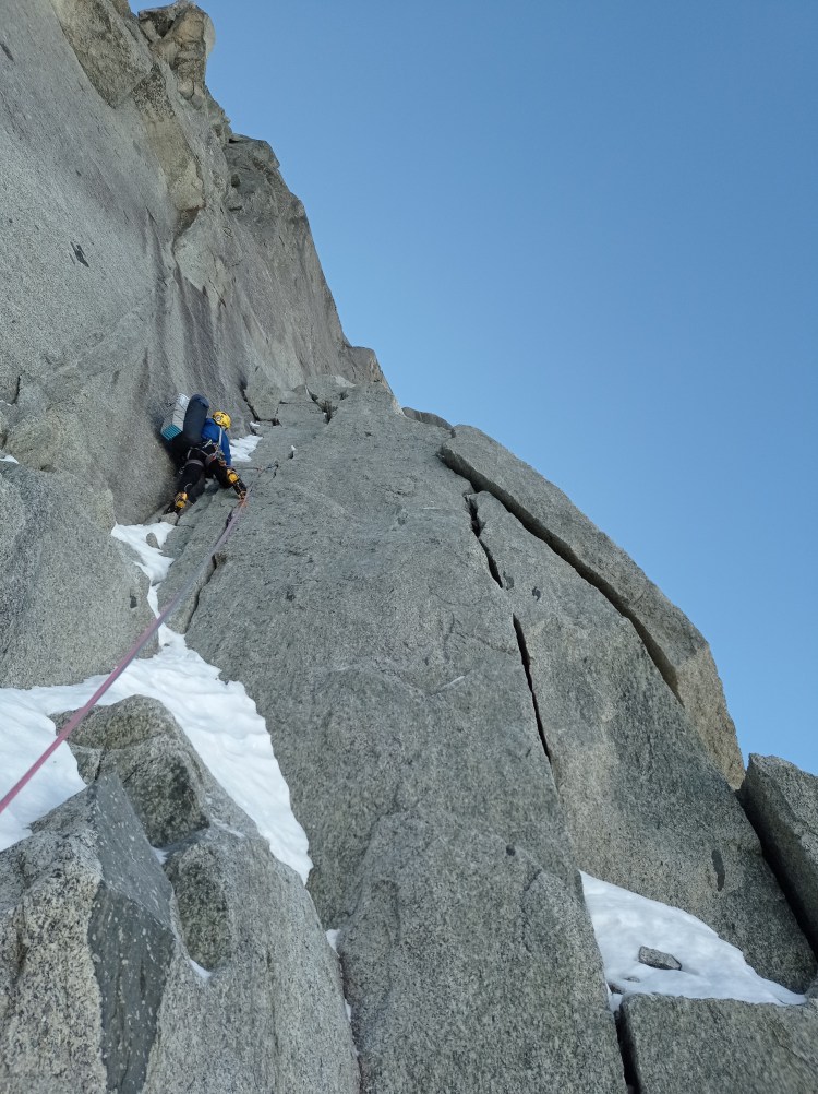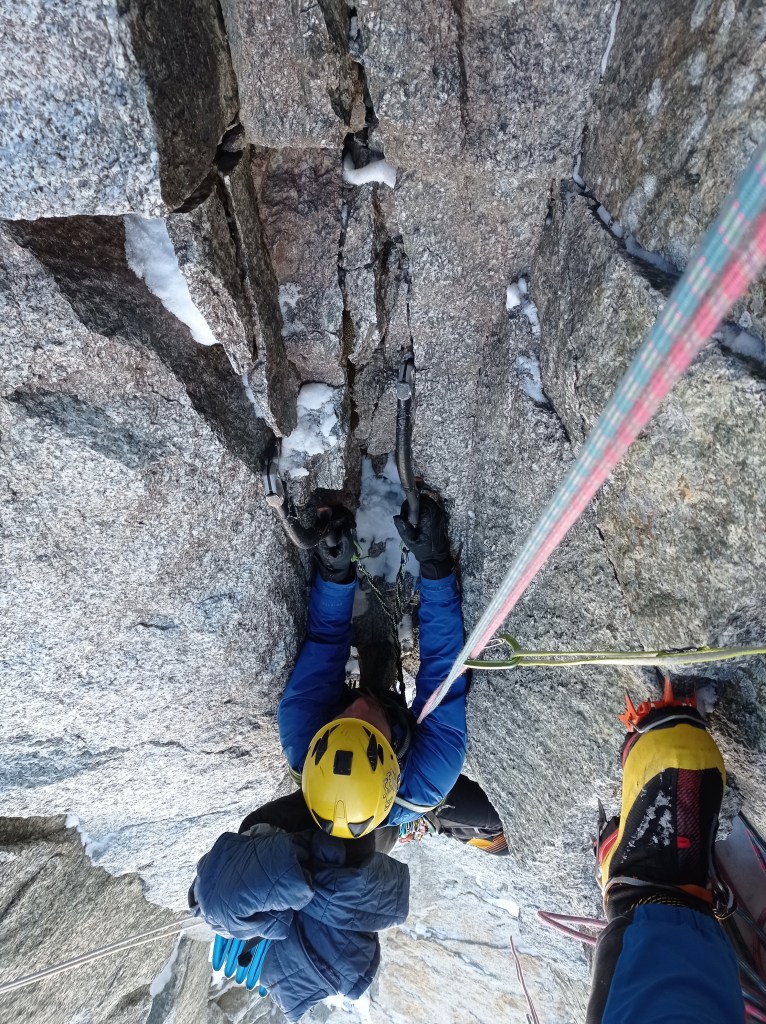 Partiamo quindi il 21 marzo alla mattina da Bergamo per Chamonix che raggiungeremo con giri mistici evitando il più possibile autostrade, strani traghetti e qualsiasi forma immaginabile di pedaggio visto che le nostre tasche di studenti non possono permettersi lussi come il traforo e le autostrade italiane. Raggiungiamo la base della parete alle 20:30 col buio dopo 3 ore di nuoto nella neve molla del ghiacciaio, scambio due parole con una cordata francese in tenda che farà la via Lesueur e costruiamo una piccola postazione da bivacco circondando un piccolo spazio piano con dei sassi per proteggerci dal vento. Per fortuna Eolo non ci fa visite sgradite e la notte passa tranquilla senza particolari problemi. La mattina ci svegliamo verso le 5:30, prepariamo con calma il tè e ci godiamo lo spettacolo dell’alba sul ghiacciaio. Circa due ore dopo siamo all’attacco della via dove parto io per il primo tiro che subito si rivelerà più impegnativo del previsto con un ultimo passaggio prima della sosta su fessurine fisiche che necessitano una buona famigliarità con gli incastri di picca. Proseguiamo poi con due lunghi tiri in conserva con i quali arriviamo alla base di un sistema di fessure nel quale si susseguono una serie di tiri in diedrini fessurati e camini che ridefiniscono il concetto di “facile”, anche un banale IV infatti scalato con picche e ramponi può risultare decisamente impegnativo soprattutto se si tratta di un’arrampicata di aderenza o in camino. Dopo quattro lunghi tiri arriviamo davanti al fotogenico traverso che porta alla famosa fessura Lambert che Dario supera senza troppi problemi rischiando però di perdere una picca magicamente staccatasi dalla sua leash rimanendo ancor più magicamente impigliata poco sotto in un cordone. Il tiro successivo è un V/V+ in fessura fuori misura che ci fa sbuffare mica male e ci costringe e incastrarci malamente alla ricerca disperata di un qualsiasi aggancio decente per le picche. Continuiamo poi con due lunghi tiri che ci portano in una zona che purtroppo non trova riscontri nelle relazioni.