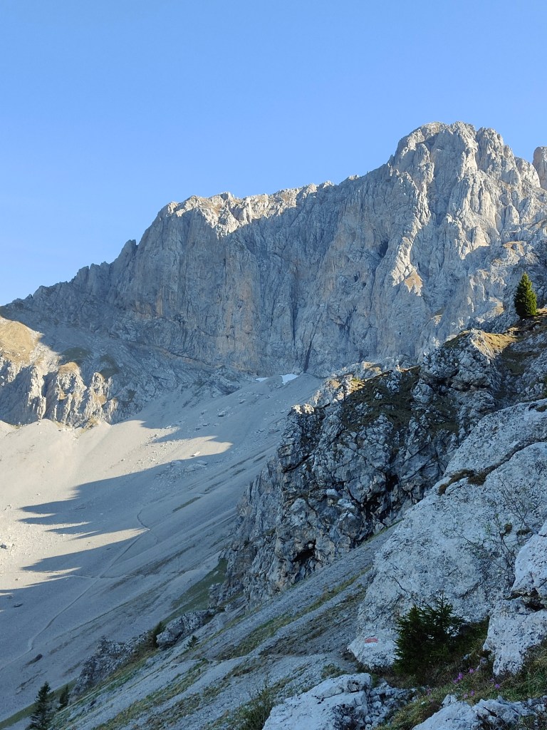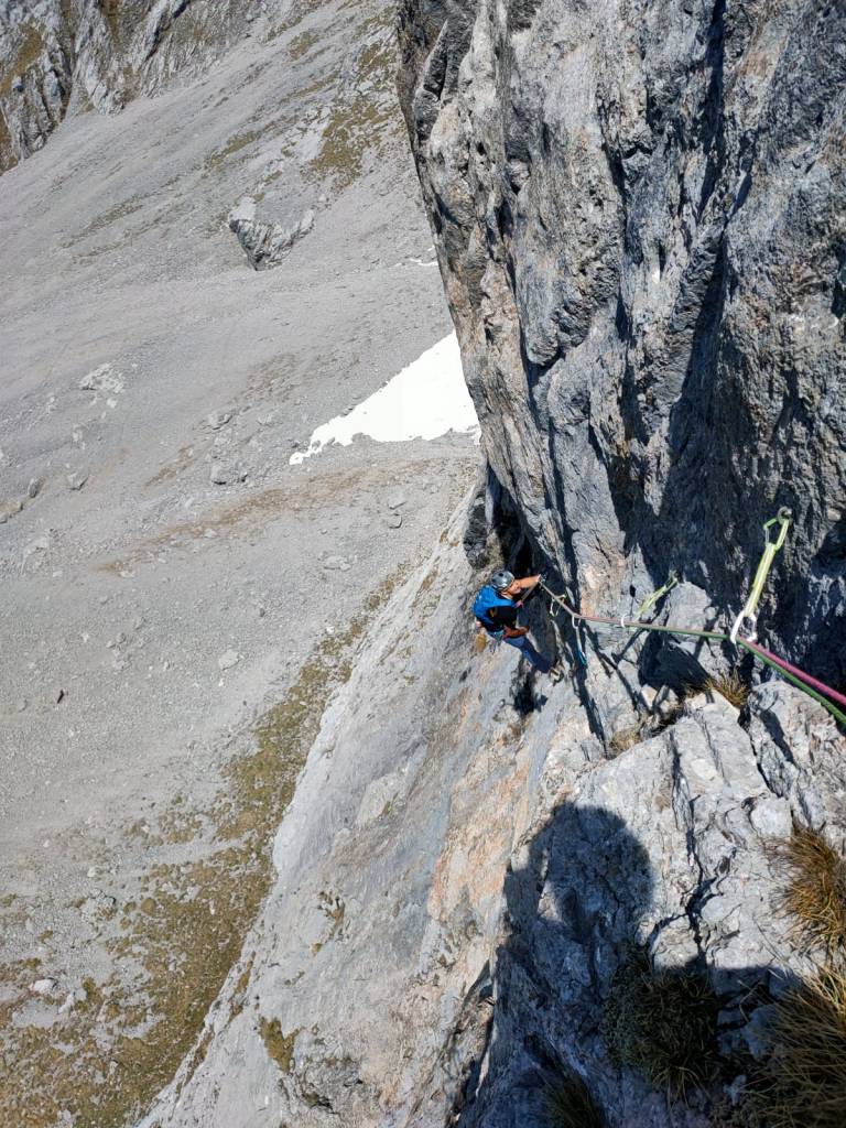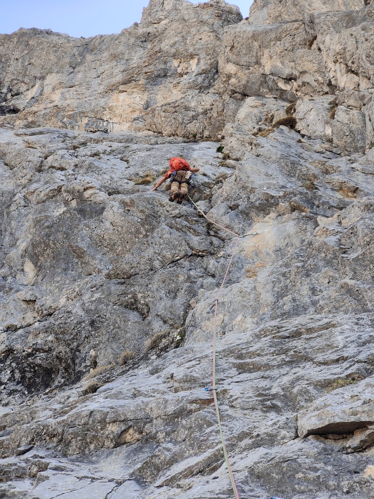 - Salire la placca facile sopra la sosta spostandosi verso sinistra fino a doppiare un spigolo. Traversare per qualche metro verso destra su roccia rotta fino ad entrare in un canale. Risalirlo per qualche metro fino alla sosta posta sulla destra. (2spit+anello) [5b, 45m]