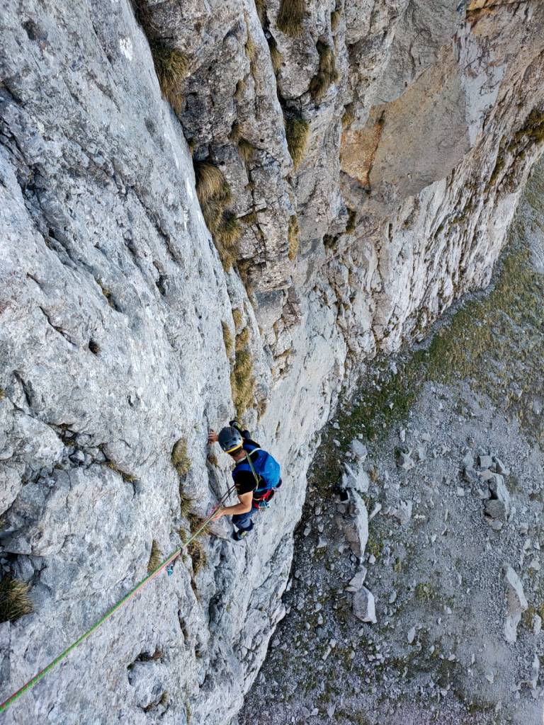- Salire la placca sopra la sosta con passo violento e continuare a sinistra in un diedro un po’ friabile fino in sosta. (3spit+anelli)[6b, 45m]