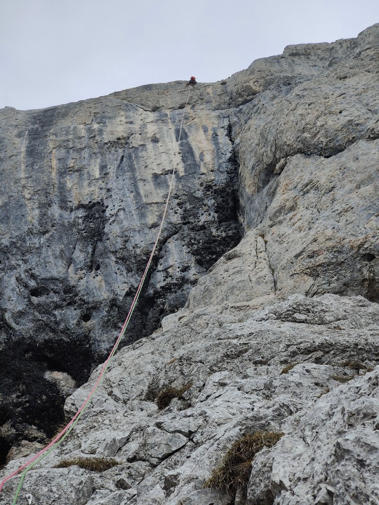 Attacco: Nella parte destra della parete su una placchetta appoggiata con spit sotto la verticale dell’enorme grottone nero a metà parete.
