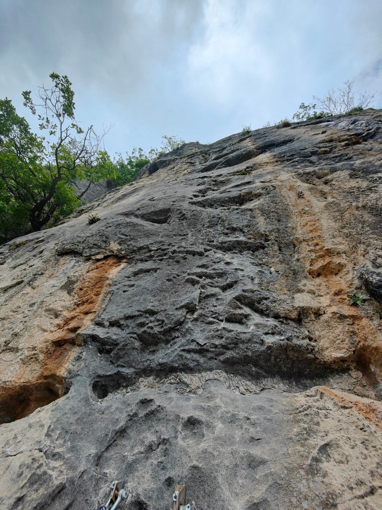 4) Salire la placca gialla a tasche sopra la sosta e poi un muretto aggettante che porta alla successiva bella placca grigia che con qualche passaggio non banale porta in sosta (2 spit). [6b, 30m]