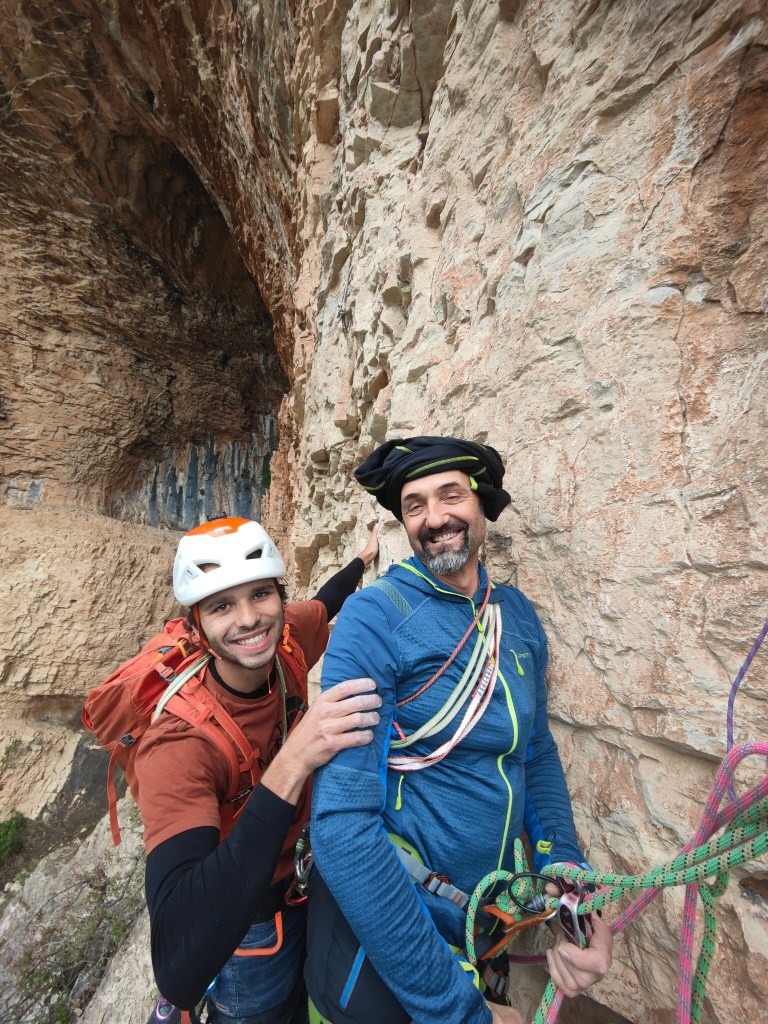 3) Salire la lama ponendo molta attenzione soprattutto all’inizio. E seguirla fino alla sua fine dove si prosegue per breve camino fino alla sosta posta poco a sinistra sotto una placca (2 spit + catena artigianale). [5c, 25m]
