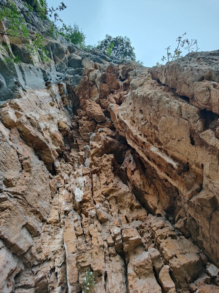4) Scalare placca sopra la sosta e poi con bella sequenza laterale superare una breve pancetta. Entrare nel bosco e seguire poi la corda fissa verso destra fino alla sosta (2 spit+ catena artigianale). [6a, 20m]