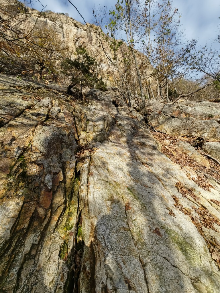 4) In obliquo verso sinistra su placca tecnica a tacche fino alla base di un risalto strapiombante che si supera con passo boulder. Ribaltarsi e in corrispondenza di un albero spinoso spostarsi a destra in placca. Risalire in placca per qualche metro fino alla sosta. [6b, 35m]