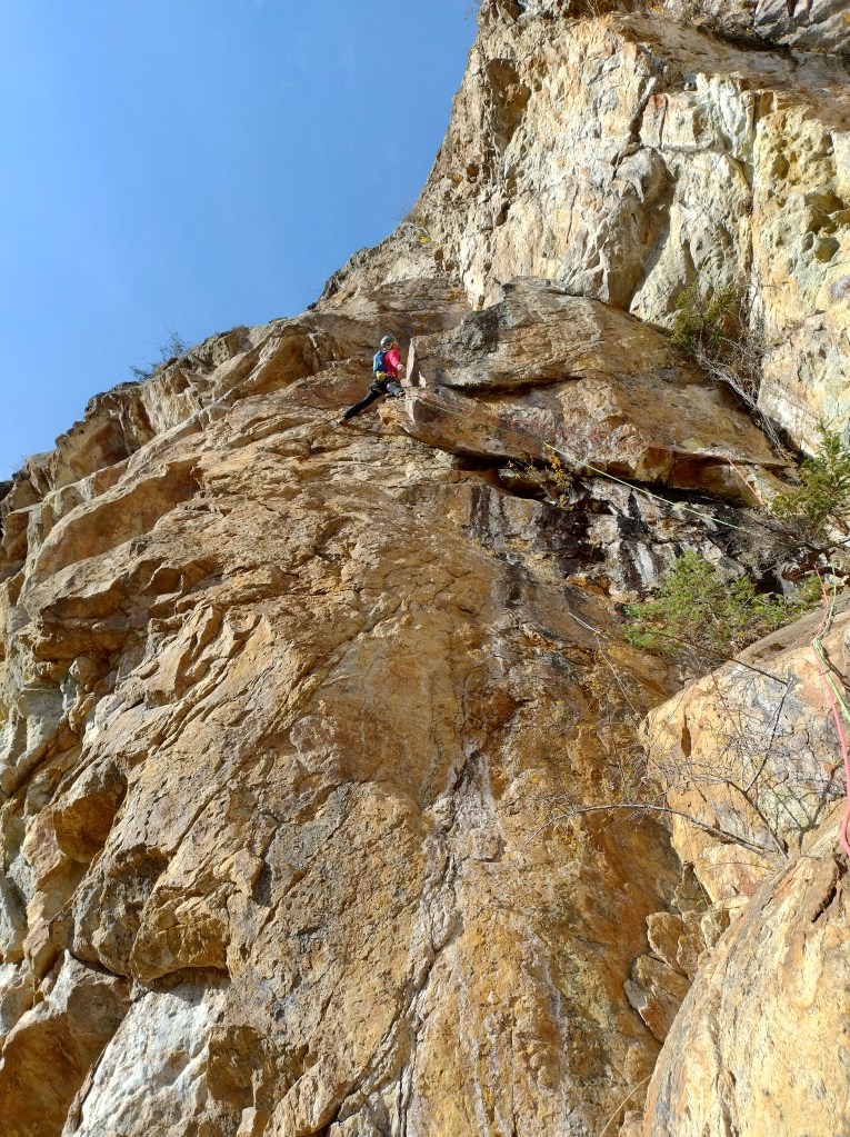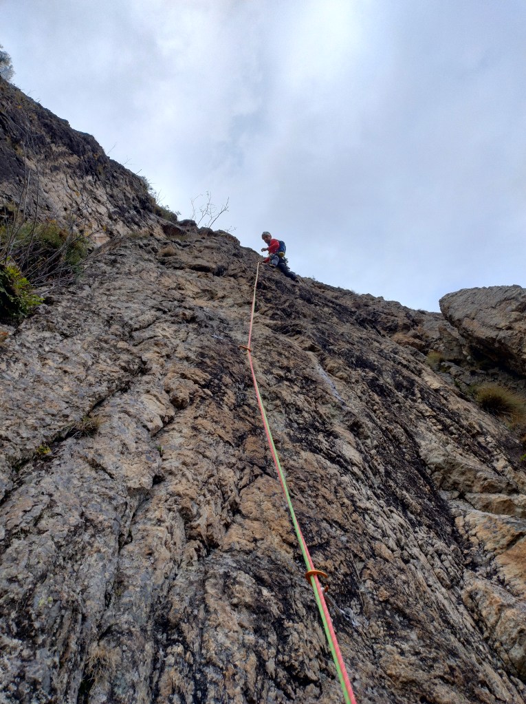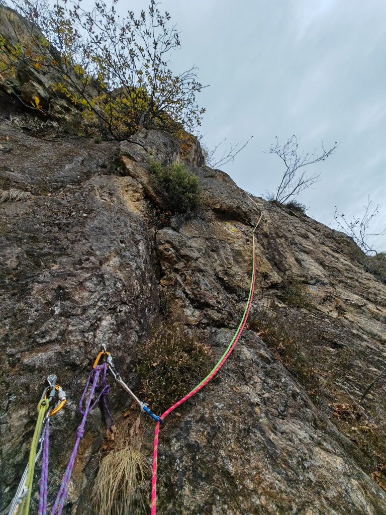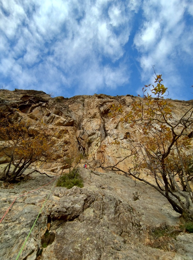 5) Tiro discontinuo e difficile da trovare, dopo i primi tre spit risalire un pilastrino e ad un albero spostarsi a destra verso un altro spit e poi con andamento obliquo verso destra raggiungere la cengia mediana. (si sosta poco sotto su pianta, noi abbiamo diviso in due il tiro facendo sosta anche al primo albero per evitare troppi attriti). [5b, 50m]