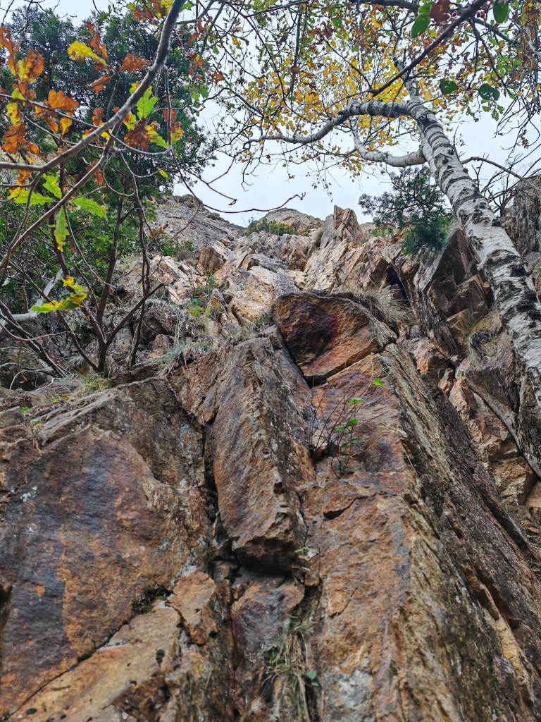 1) Salire le placche appoggiate sopra l’attacco seguendo i punti di debolezza, puntare alla base dell’evidente lama orizzontale che caratterizza il secondo tiro. Il tiro volendo si può dividere in due (tanti alberi su cui sostare sul tiro). [IV, 70 m]