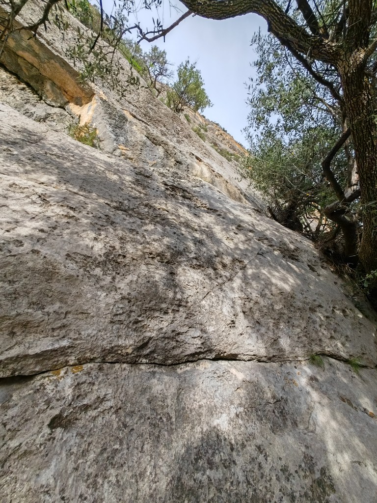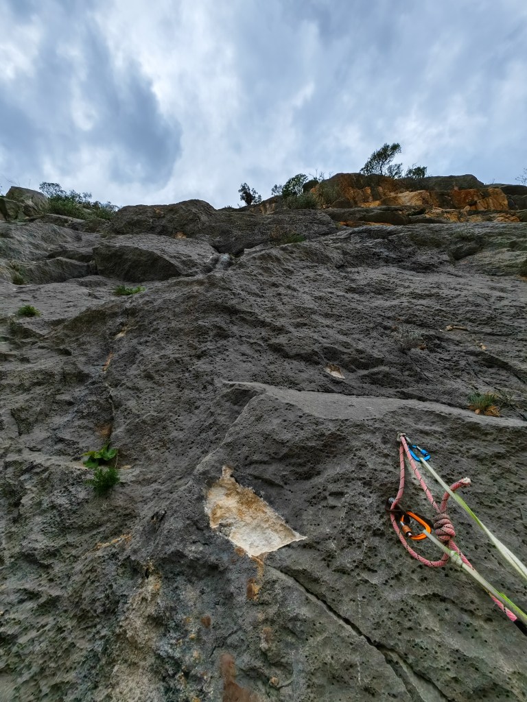 3) Obliquare verso sinistra per placca fino alla base di uno spigoletto strapiombante che si risale con passi un po’ “rigidi” fino ad un alberello da cui ci si sposta di nuovo in placca a destra. Continuare con passi delicati su gocce fino a un bombé che si evita a sinistra per facile fessura che porta in sosta. [6c, 30m]