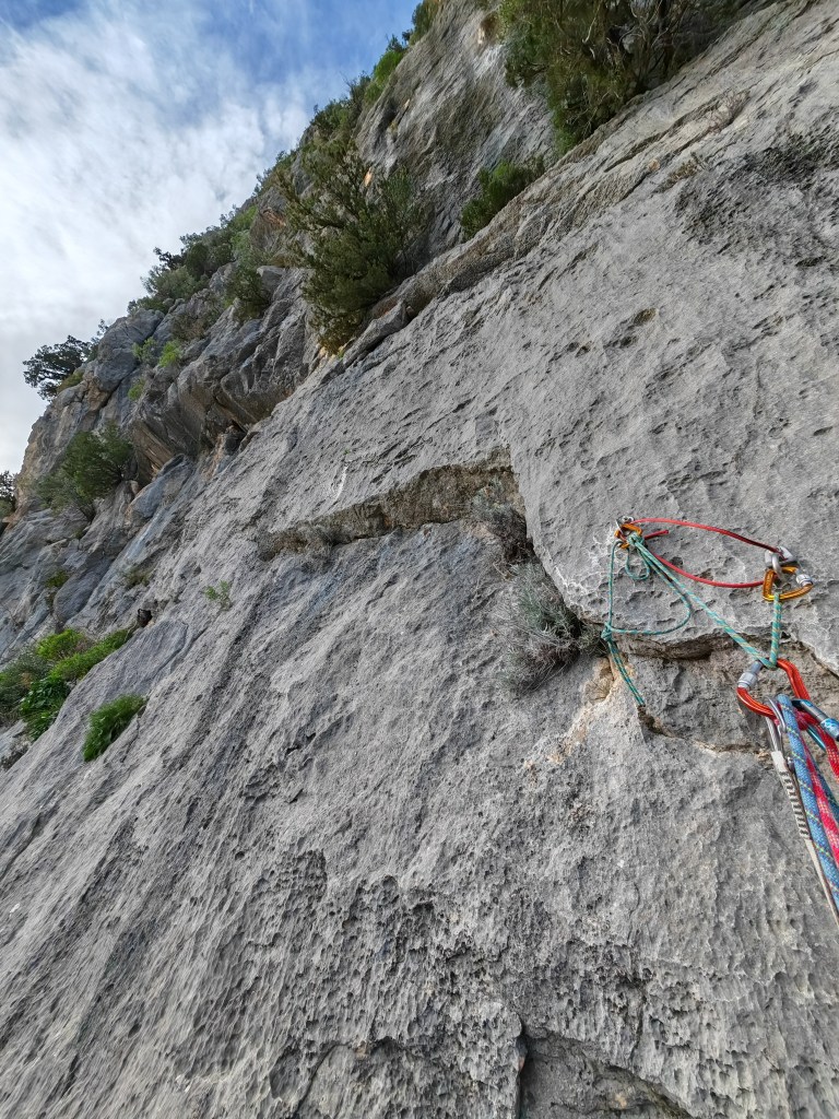 Bella via su roccia spaziale a tratti veramente stupefacente come sul secondo tiro. Protetta bene ma comunque mantenendo l’obbligato dichiarato. Tutte le soste sono su due spit.
