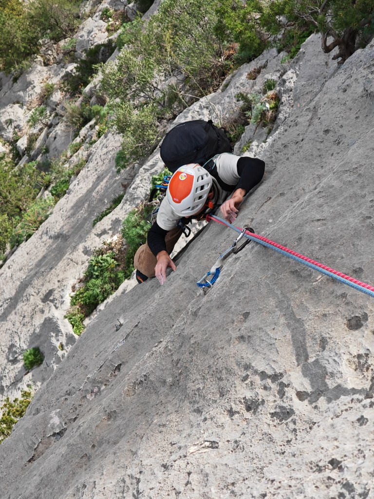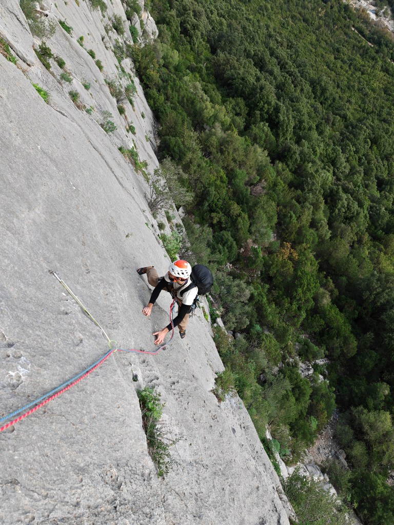 7) A sinistra della sosta per breve diedrino poi passo ostico per superare un altro diedrino liscio. Segue una placca a gocce molto bella e un ultimo strapiombo ammanigliato dopo il quale, traversando qualche metro a destra, si arriva in sosta. [6b+, 35m]