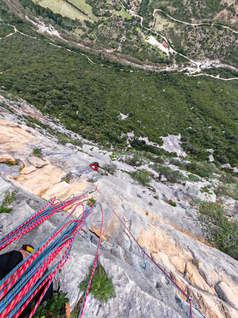 È possibile scendere in doppia dalla via sfruttando le soste munite di maglia rapida/anello di calata ma secondo me è più consigliabile una volta finita la via traversare mantenendo la quota verso la direzione opposta di provenienza fino a trovare un sentiero ben tracciato che conduce nuovamente alla sterrata e poi a ritroso alla macchina. Percorso simpatico e credo preferibile alle doppie dove l’incastro è sempre dietro l’angolo. Anche le tempistiche penso siano abbastanza paragonabili noi ci abbiamo messo 1h scendendo dal sentiero per ritornare alla macchina.
