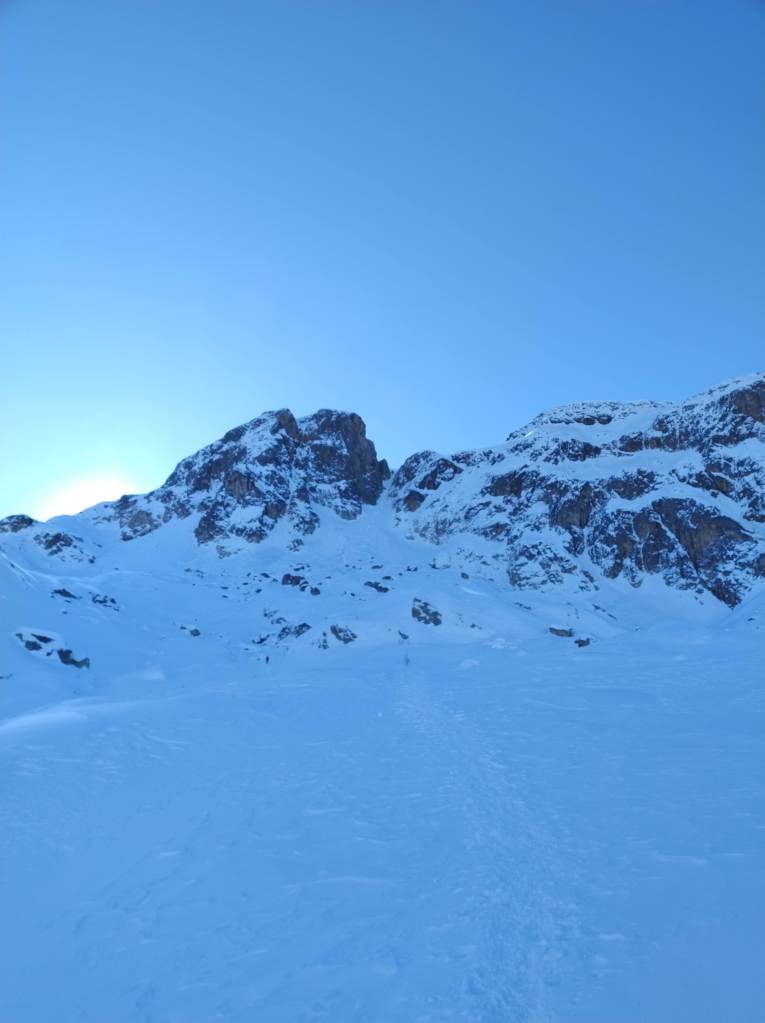 La via del Gran Diedro sulla parete Nord del Cabianca è un itinerario aperto nel 1968 da Calegari, Farina e Sugliani. La linea segue i punti deboli della parete puntando al gigantesco diedro che è impossibile non notare anche dalla base della parete. Se salito d’estate regala una salita divertente e isolata nel cuore della conca del Calvi con difficoltà fino al VII-. Arrampicando nel diedro a luglio di due anni fa mi ero subito reso conto che questa via si sarebbe prestata molto bene a una salita invernale con picche e ramponi in quanto presenta spesso piccole fessure inutili per le mani ma perfette per le lame delle picche. Inoltre il quarto tiro d’estate è spesso bagnato e pieno di toppe d’erba molto fastidiose, caso a parte poi è il tiro chiave su roccia alquanto dubbia e decisamente poco piacevole da scalare in libera con le scarpette. Comunque dopo due anni mi torna in mente questa idea e la propongo subito a Luca come al solito. Inizialmente non è convintissimo ma riesco in qualche modo a fargli cambiare idea e dopo qualche giorno siamo a Carona pronti per partire. Facciamo tutto il primo tratto di avvicinamento con gli sci e gli scarponi per scalare nello zaino… Che fatica! Poi alla diga abbandoniamo sci e scarponi da skialp per proseguire a piedi più agilmente sulla traccia perfetta che porta al canale nord. La traccia fortunatamente è veramente uno spettacolo e ci permette di portarci velocemente all’attacco nonostante il peso dello zaino. Una volta arrivati sotto, la parete sembra totalmente secca e priva di ghiaccio o neve, Luca tenta (invano) di convincermi a cambiare piano e alla fine dopo qualche minuto di preparativi mi ritrovo a scalare sul primo tiro. Nonostante le funeste previsioni si rivela divertente e delle compatte placche di neve pressa spuntano fuori come funghi dal nulla. Il secondo tiro che tocca a Luca invece è praticamente total dry ma come ammetterà anche lui, nonostante l’assenza di ghiaccio, è veramente bello da scalare con un susseguirsi di incastri e agganci di picca. Il resto della via scorre senza intoppi fra incastri, toppe d’erba congelate e qualche tratto su neve pressa durissima. Dopo 5 ore ci ritroviamo in cima al Cabianca con ancora il piacevole tepore del sole che ci scalda le membra, incredibile pensavamo di fare notte! Ora rimane la lunga discesa prima dal canale nord e poi di nuovo fino alla diga, per fortuna l’ultimo lungo tratto sull’autostrada Carona – Calvi è passato in un attimo con gli sci.