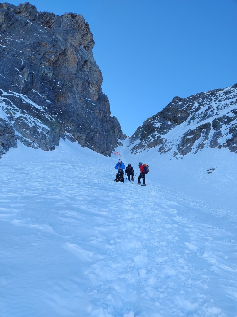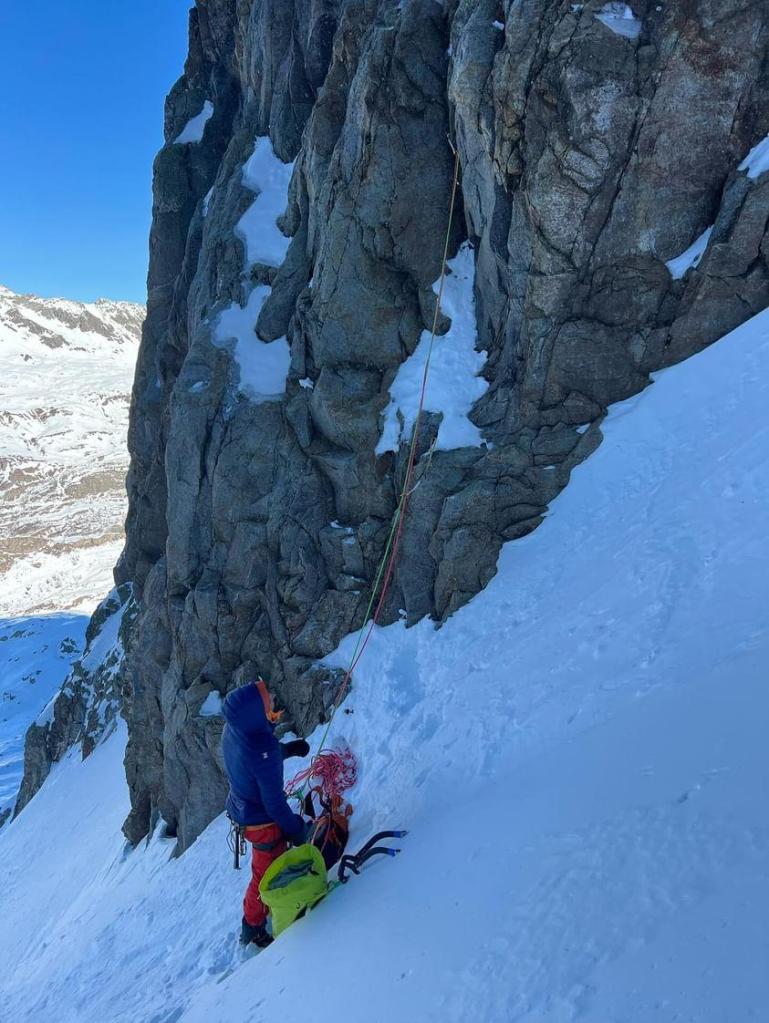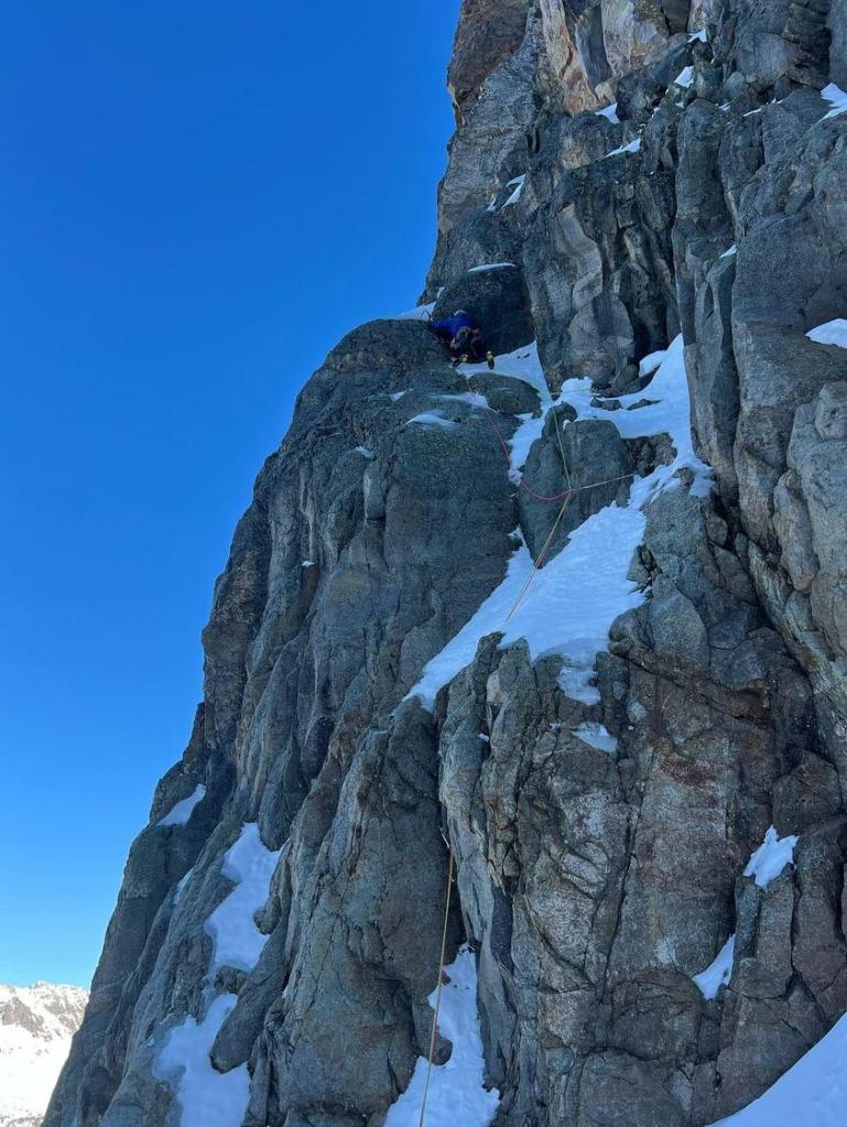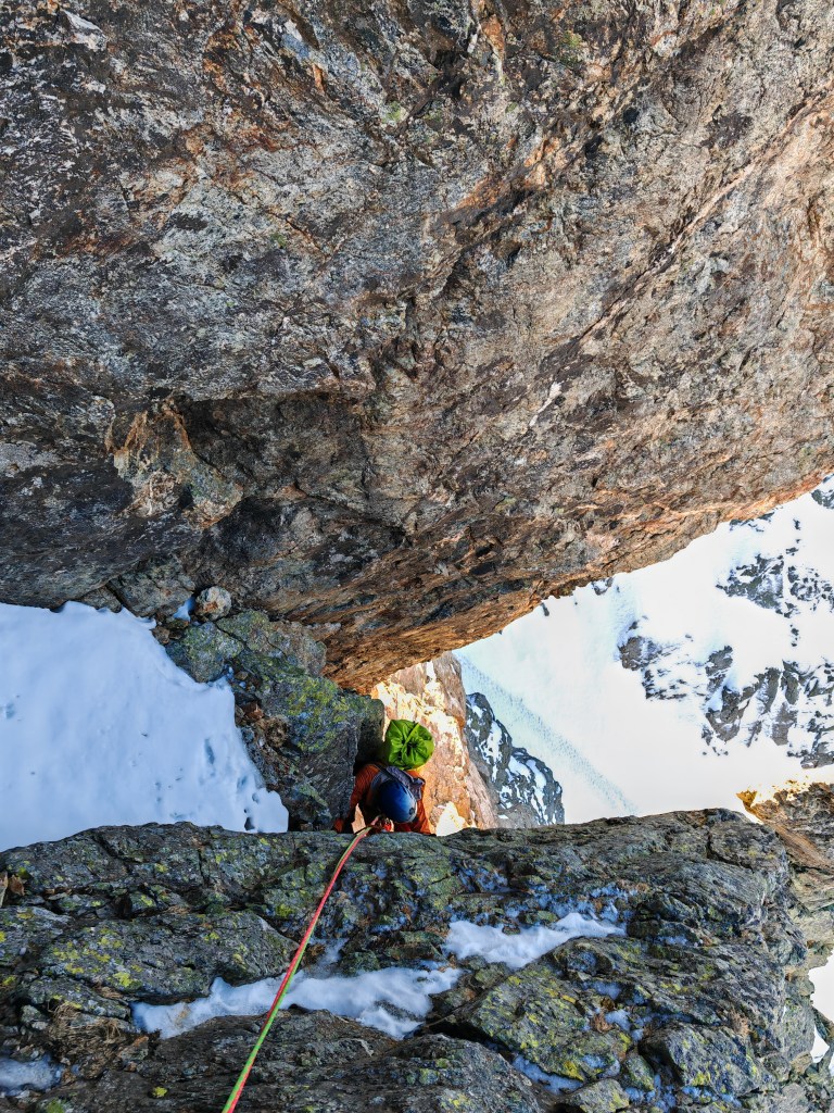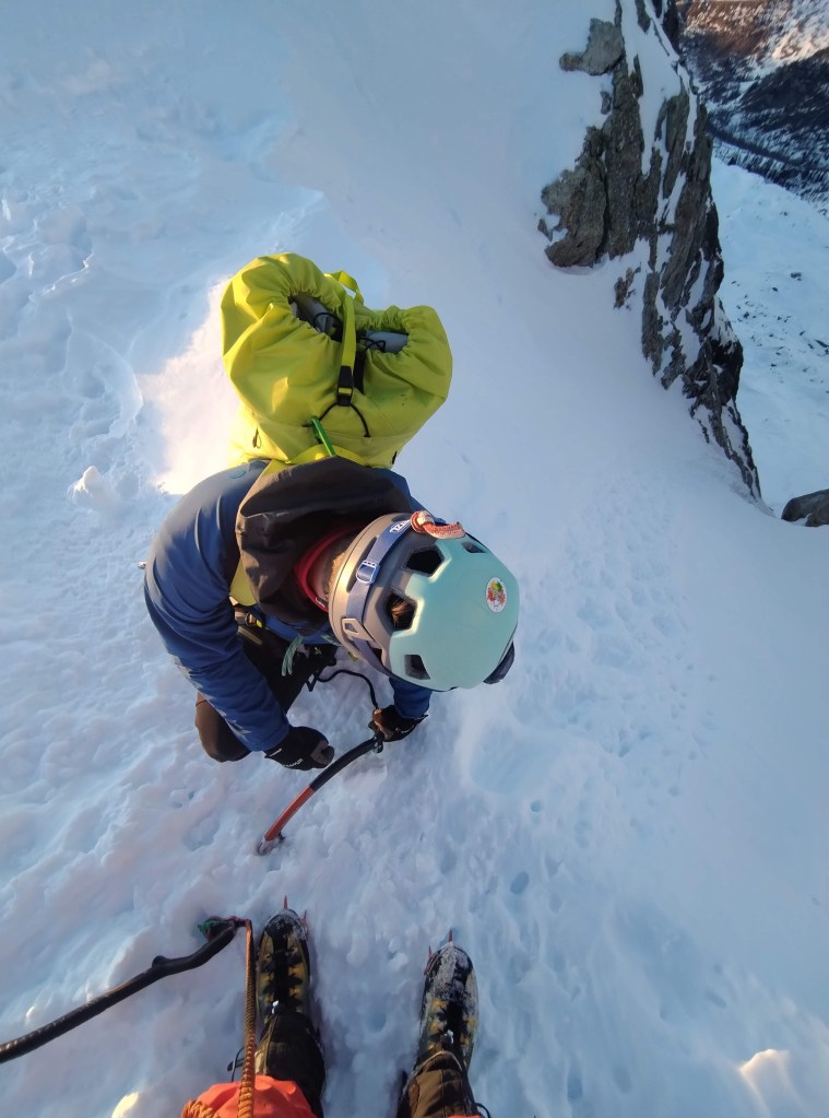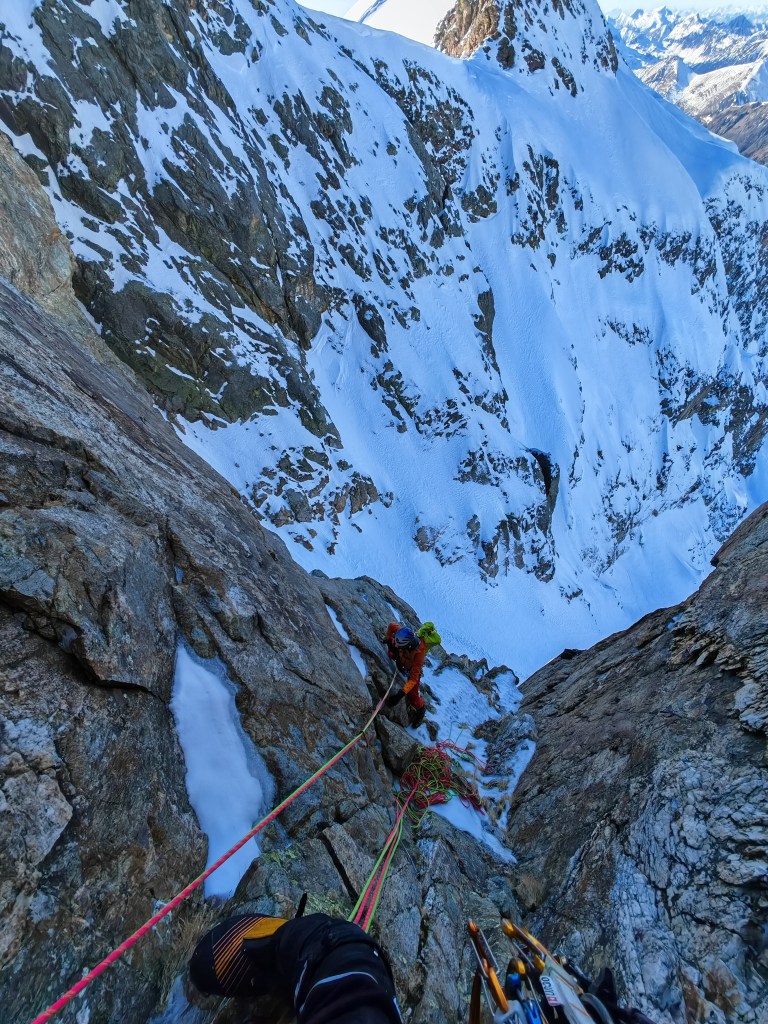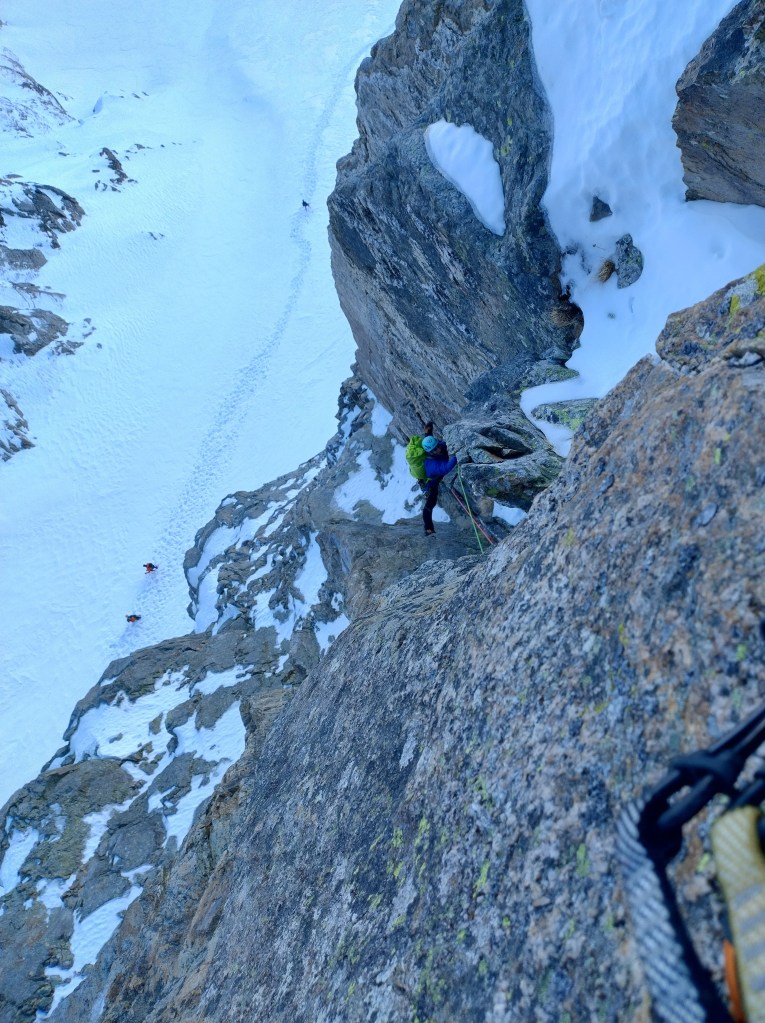 6) Seguire la fessurina sopra la sosta verso sinistra, uscire su placche di neve e superare un saltino roccioso. Poi per neve fino alla cresta poco sotto la vetta (sicura a spalla posizionandosi sul lato opposto della cresta). [M4, 45m]