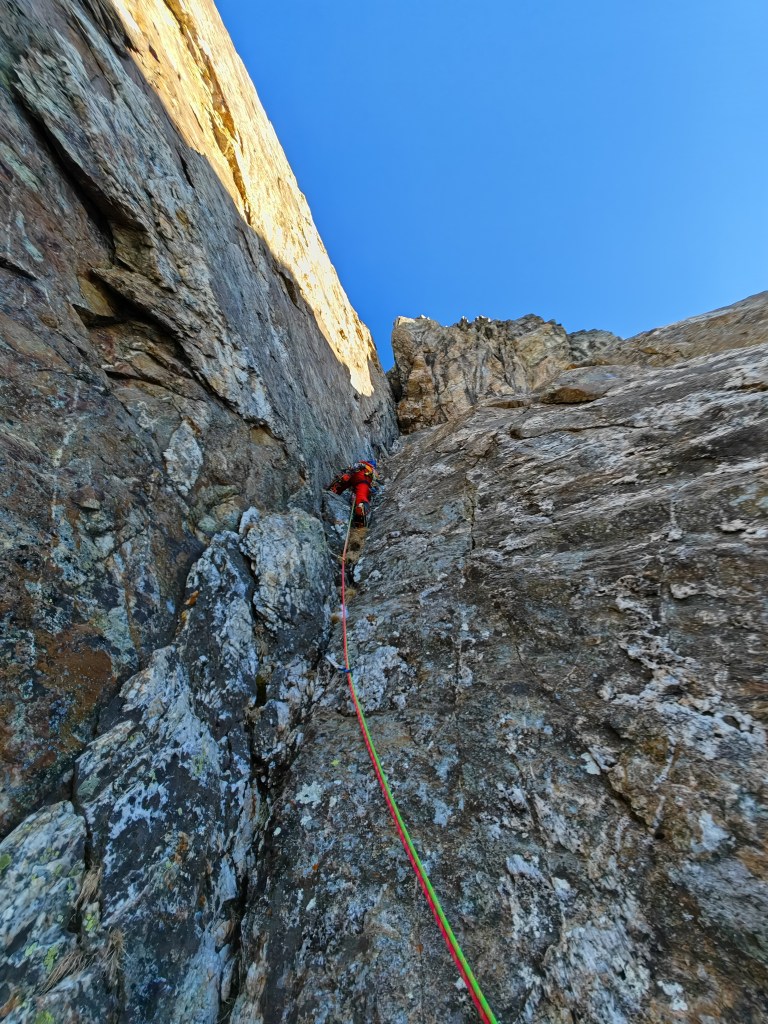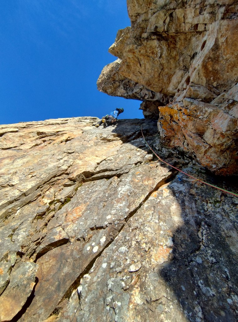 2) Salire la facile placca a gradoni a sinistra della sosta puntando al secondo diedro da sinistra. Salire nel diedro (chiodi) con incastri di picca spettacolari e con un passo ostico per andare a prendere la toppa d’erba della salvezza. Arrivati in una specie di nicchia spostarsi a destra qualche metro fino a prendere un fessurino (chiodi) che si risale ancora con incastri goduriosi fino alla sosta posta appena sotto uno strapiombino. [M6 continuo, 35m]