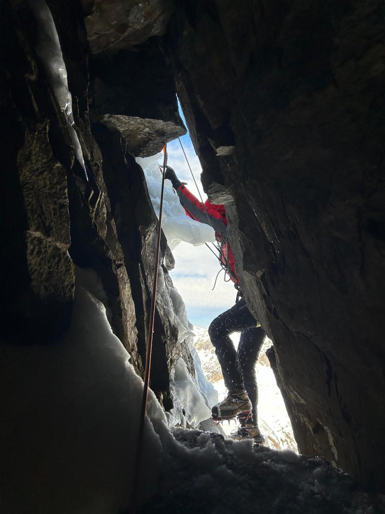 4) Continuare nella goulotte fino alla grottine, entravi dentro e salire qualche metro sfruttando un grosso masso incastrato. Uscire dalla grotta sfruttando la finestra che si crea fra il masso e il bordo superiore della grotta. Continuare ora su neve/ghiaccio fino a una pareti a rocciosa sulla sinistra dove si allestisce una sosta su friend (0.75+1). [M4+, 40]