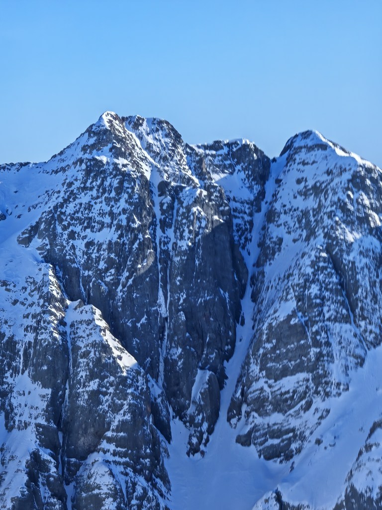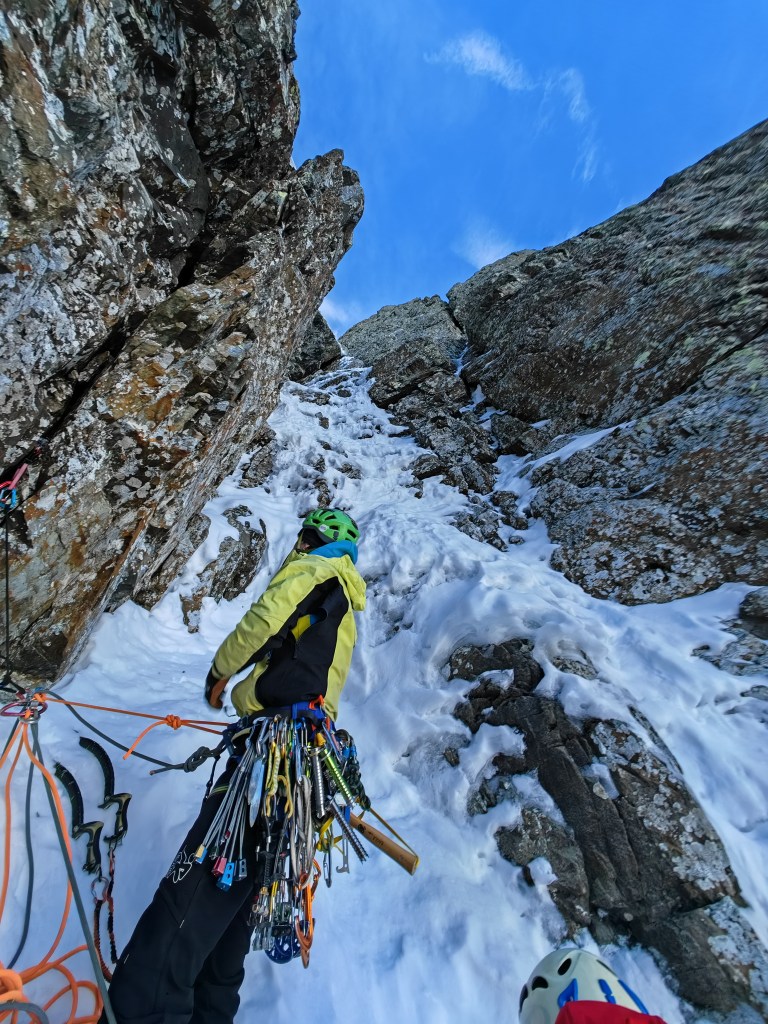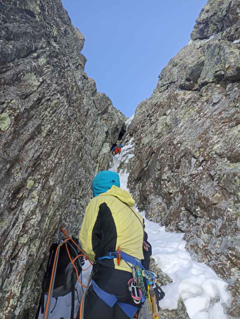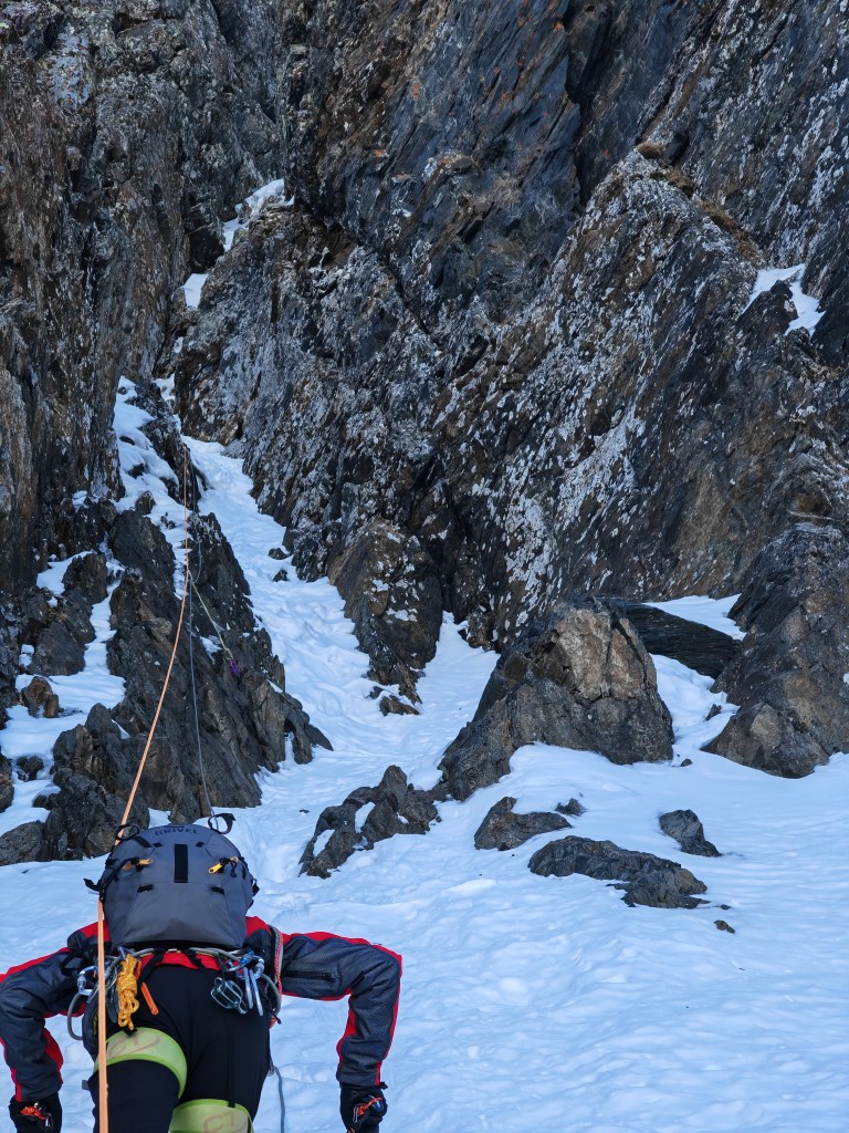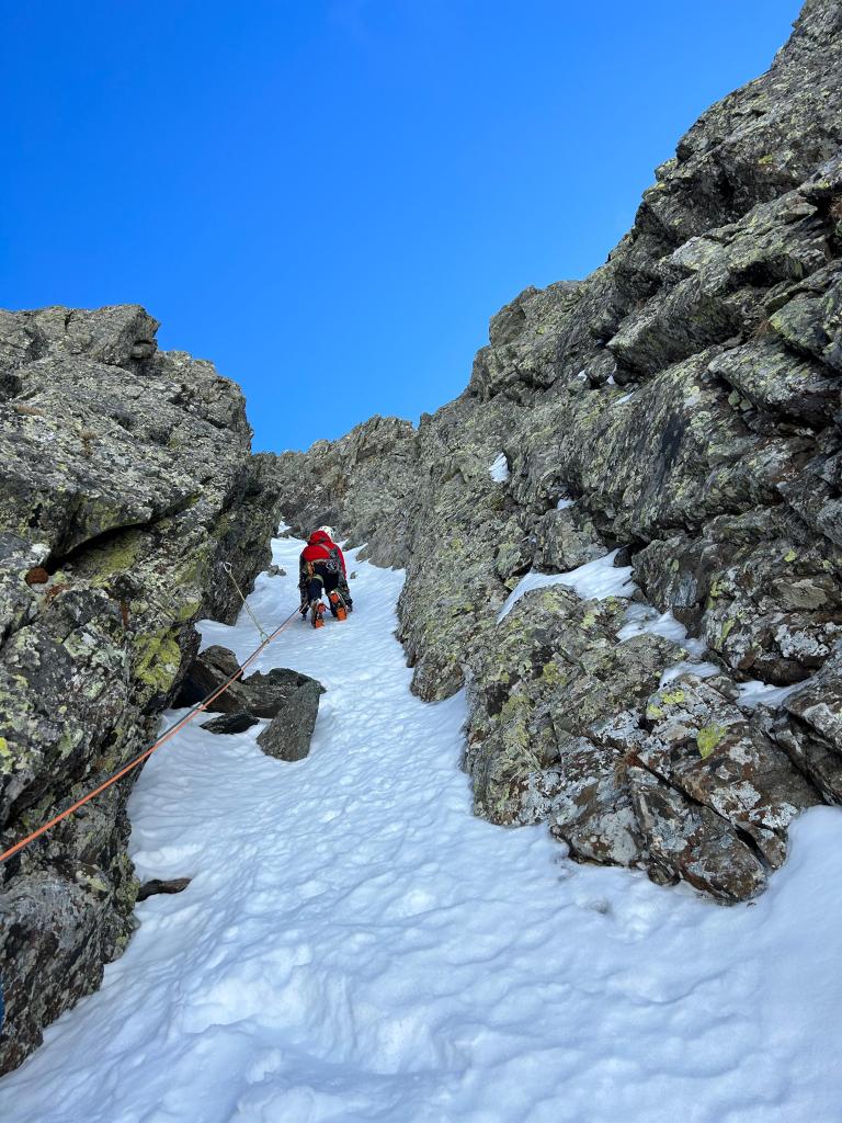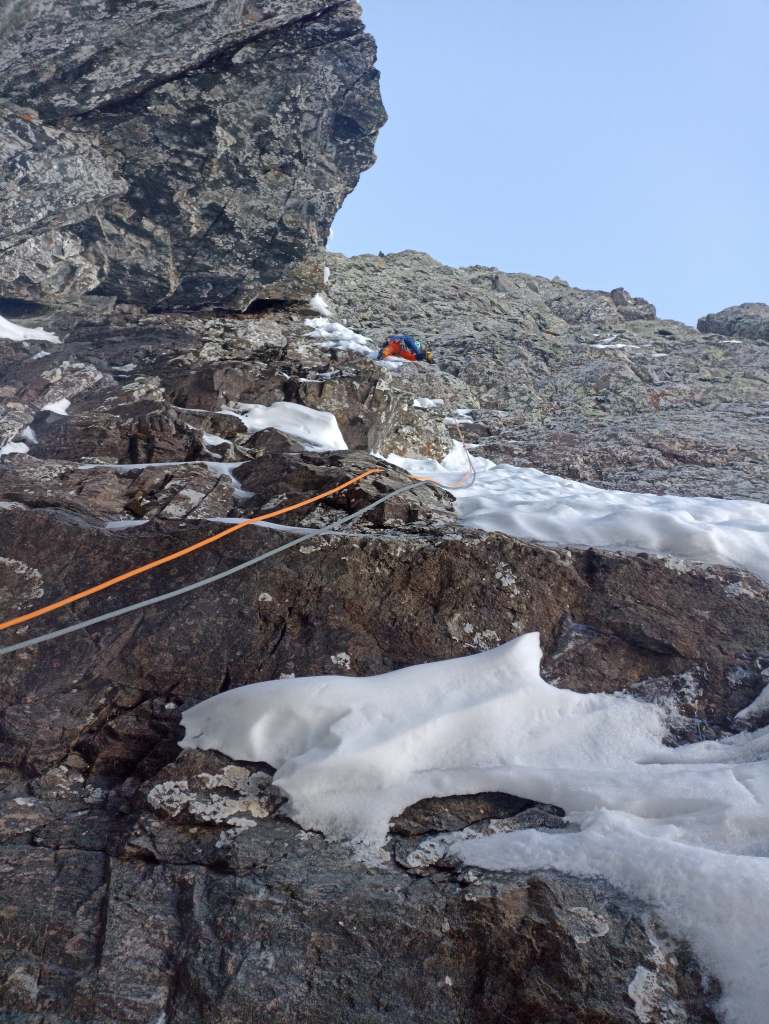 5) Continuare nell’evidente goulotte a destra fino a quando questa finisce con una salto roccioso che si supera direttamente fino a sbucare in cresta. Spostarsi ancora una decina di metri verso sinistra in cresta e fare sosta su uno spuntone. [M3, 60m]