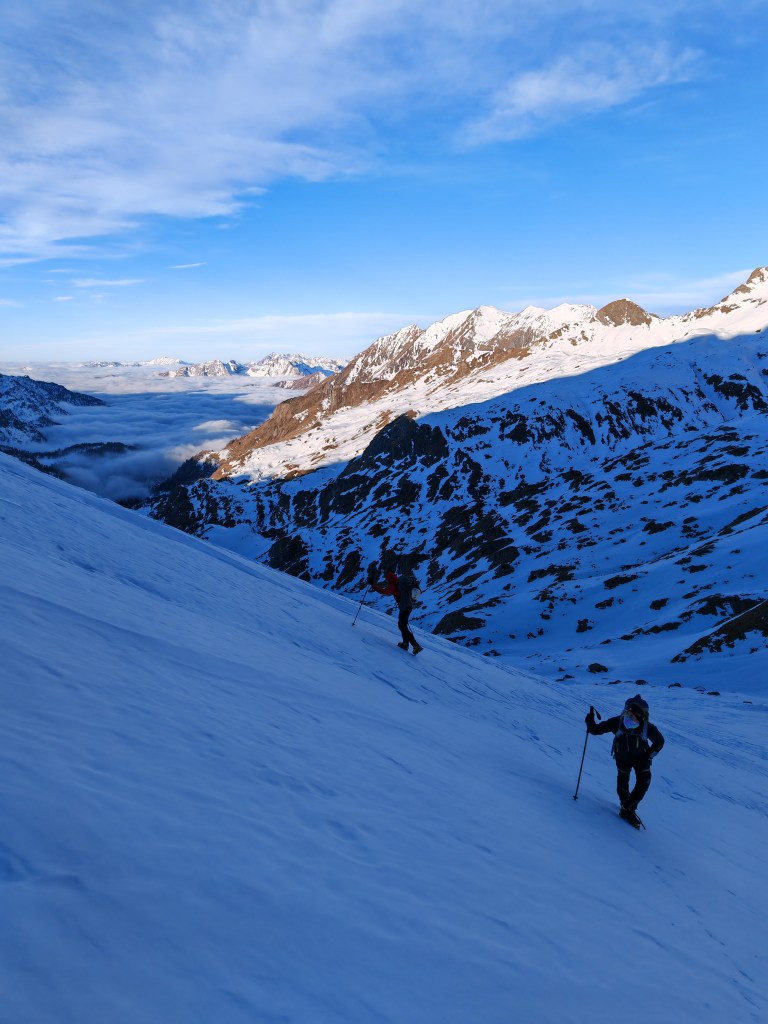 Dalla vetta (omino) Seguire la cresta affilate verso sud con passaggi molto esposti e raggiunto un pendio aperto abbassarsi qualche decina di metri per poi traversare a sinistra (faccia a monte) verso il colletto da cui scende il canale nord. Raggiunto il colletto scendere il canale fino a raggiungere di nuovo l’attacco e poi a ritroso. [30min]