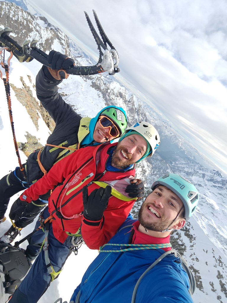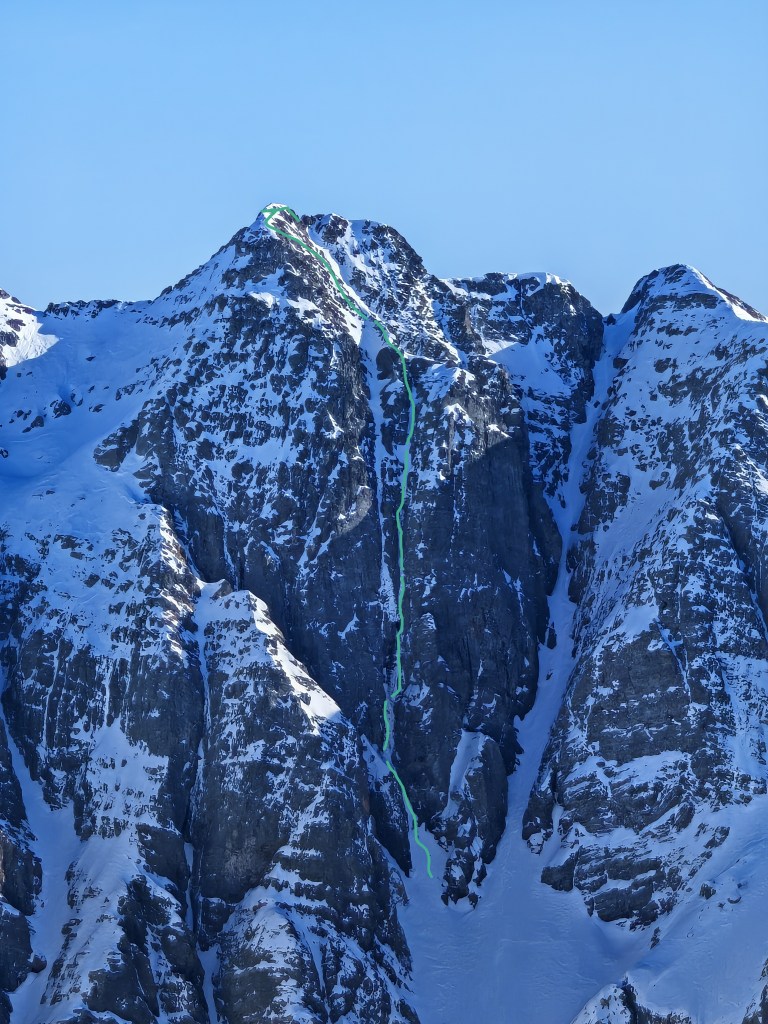 Via aperta insieme a Federico Centurioni e Fabio Romiti dopo che avevo visto la linea dalla cima dell’Aga qualche giorno prima. Linea molto logica e divertente con alcuni tiri davvero entusiasmanti, il terzo in particolare era veramente uno spettacolo nelle condizioni trovate da noi. La via segue un colatoio verticale interrotto da due grottine con neve pressa e ghiaccio da fusione incollato sulla roccia. Non è stato lasciato niente in via, alla fine delle difficoltà con un facile tiro si raggiunge direttamente la vetta del Grabiasca.