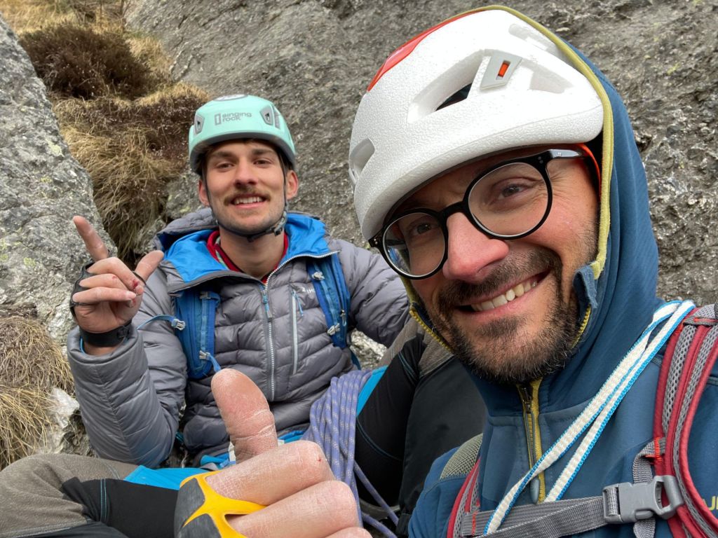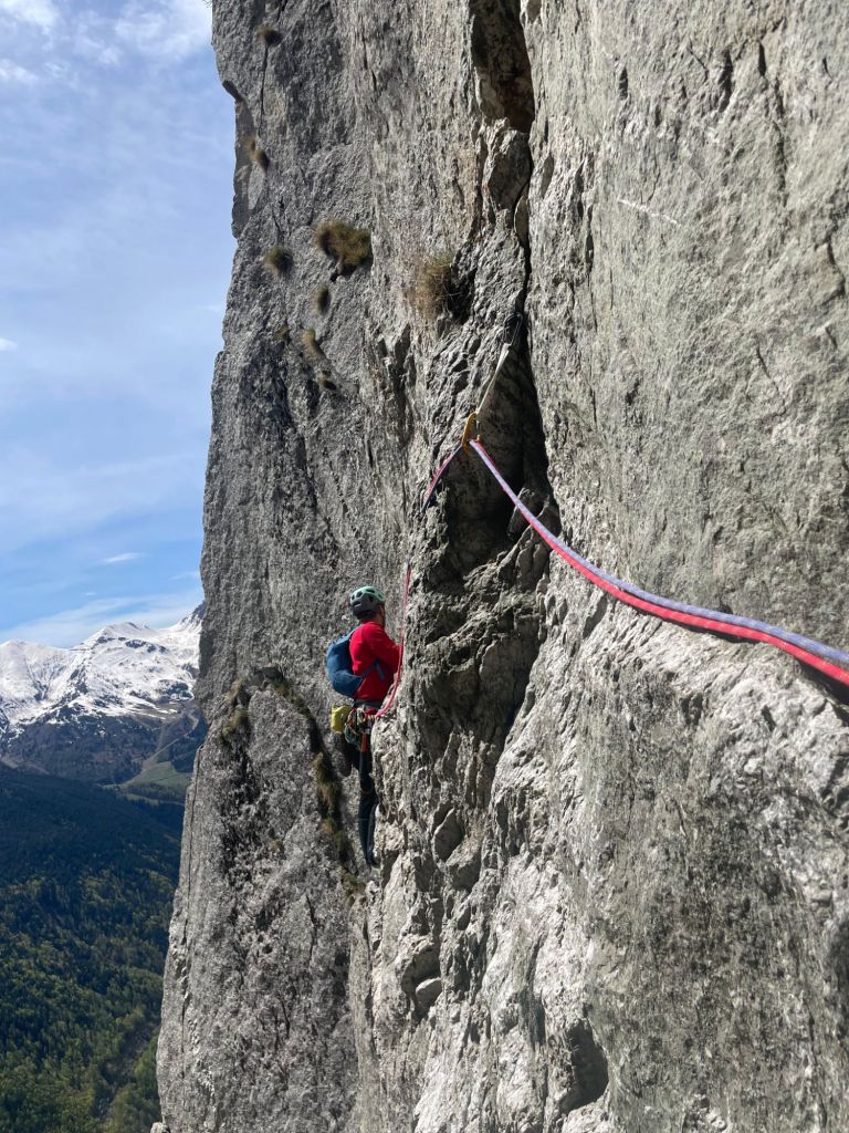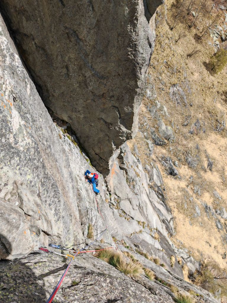 3) Salire sopra la sosta fino a raggiungere la base del tetto, a questo punto traversare lungamente a destra per placca delicata su tacche fino a quando conviene salire di nuovo qualche metro fin sotto al tetto. Traversare ancora a destra sfruttando degli appigli sotto il bordo del tetto, continuare poi per placca verso destra fino a una fessura dove si sosta su due friend sopra un terrazzino erboso (sosta su friend #1 e #2). La sosta originale è su chiodi poco più sopra ma è molto scomoda essendo appesa, conviene sostare sotto su due friend. [VI, 40m]