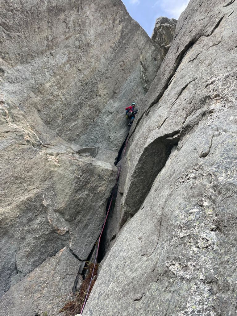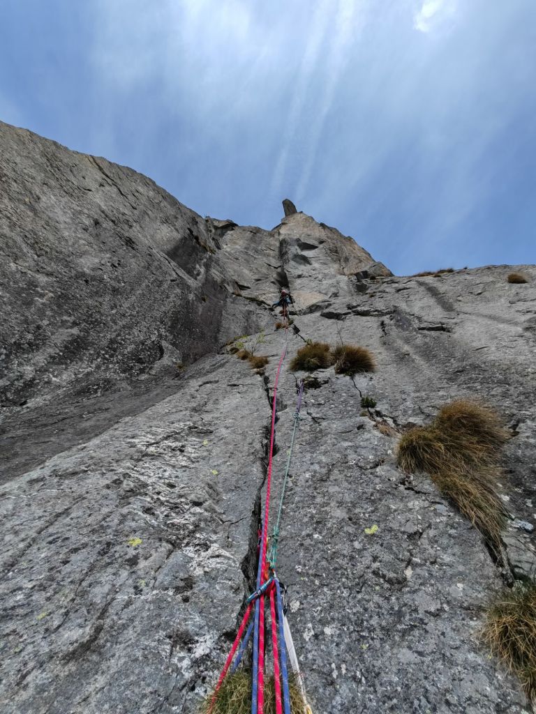 Gran bella salita molto logica e estetica. Sale i punti deboli della parete sud del pinnacolo sfruttando una serie di fessure quasi ininterrotta con un paio di traversi delicati in placca. Il famoso camino dell’ottavo tiro è effettivamente protetto lungo e potrebbe mettere a dura prova i non avvezzi tuttavia un occhio attento saprà trovare qualche possibilità di protezione in provvidenziali buchetti ai lati del camino (comunque rimangono tratti lunghi improteggibili).