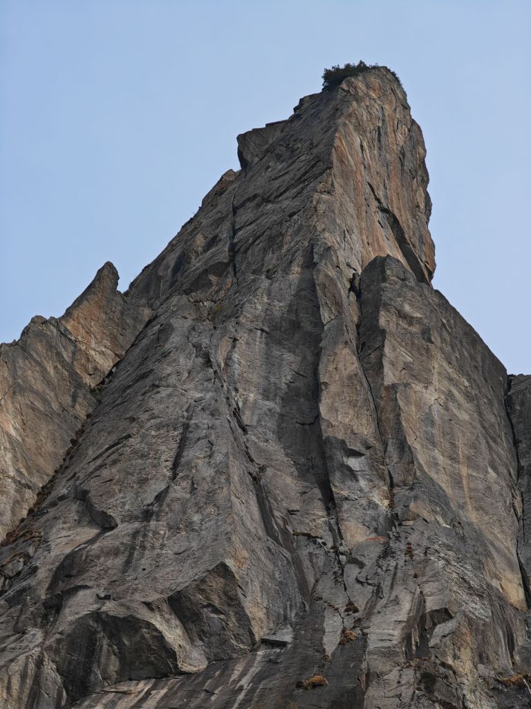 2) Spostarsi a destra della sosta (non seguire i fix in placca) e prendere un sistema di fessurine sul filo dello spigolo della placca. Proseguire dritti cercando i passaggi più semplici fino a quando conviene spostarsi un po’ a destra dello spigolo. Risalire dei risalti fino ad un terrazzino con albero sotto il grande tetto (chiodo+golfaro). [V, 50m]
