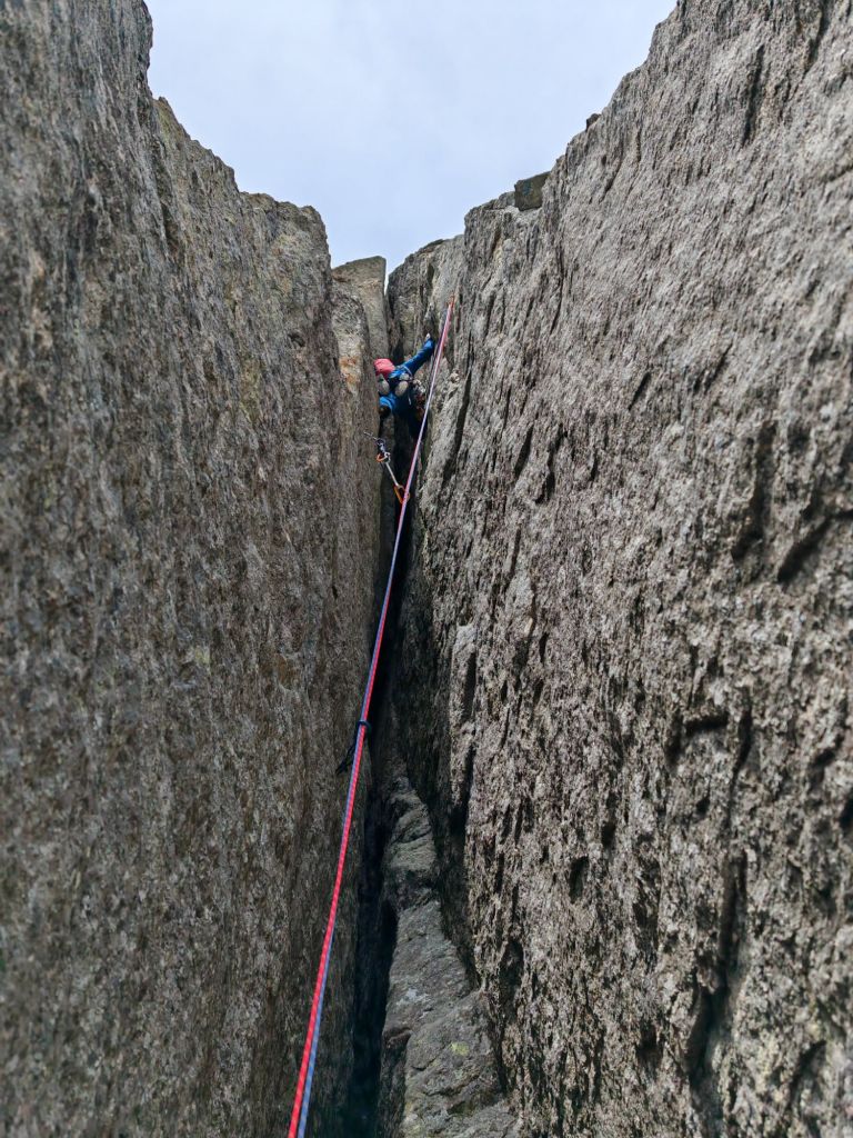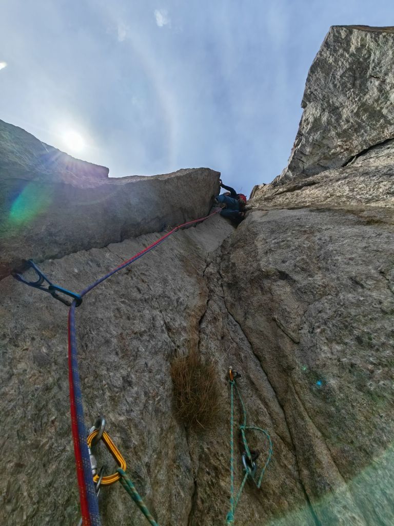 9) Salire la fessura di destra del tetto inizialmente per camino molto stretto e poi fessura ad incastro verso destra. Alla fine della fessura spostarsi a sinistra e uscire per facili placche che conducono in vetta (sosta su due fix). [VII-, 50m]