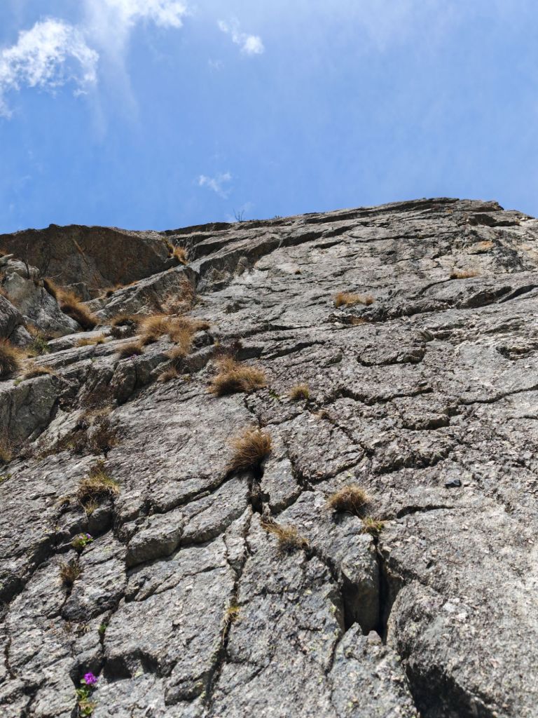 5) Traversare a sinistra su placca con cristalli di quarzo abbassandosi di qualche metro per arrivare al secondo chiodo. Dal chiodo abbassarsi nuovamente verso sinistra fino a prendere una lama che si risale interamente fino alla sosta posta alla base di una fessura strapiombante (2 chiodi+golfaro). [VI, 30m]