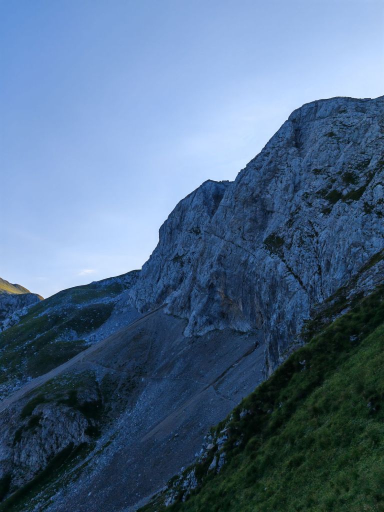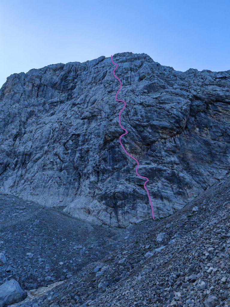 Attacco: Dal parcheggio alto a 1600m per il rifugio Capanna 2000 (strada a pagamento 4 euro) seguire il sentiero che sale verso il rifugio. Dal rifugio continuare ancora poche centinaia di metri per costone erboso con sentiero verso l’arera per poi prendere a sinistra il sentiero CAI 244. Seguirlo fino a una selletta dove scendendo ripido il sentiero vi porta alla base della parete ora ben visibile. Non salire subito il ghiaione ma continuare per sentiero che traversa sotto il ghiaione fino a quando sulla destra non si intravede una traccia che sale il ghiaione. Risalire la traccia fino all’attacco posto sotto una placca verticale incisa da una fessura (targhetta alla base). [1:20 h]