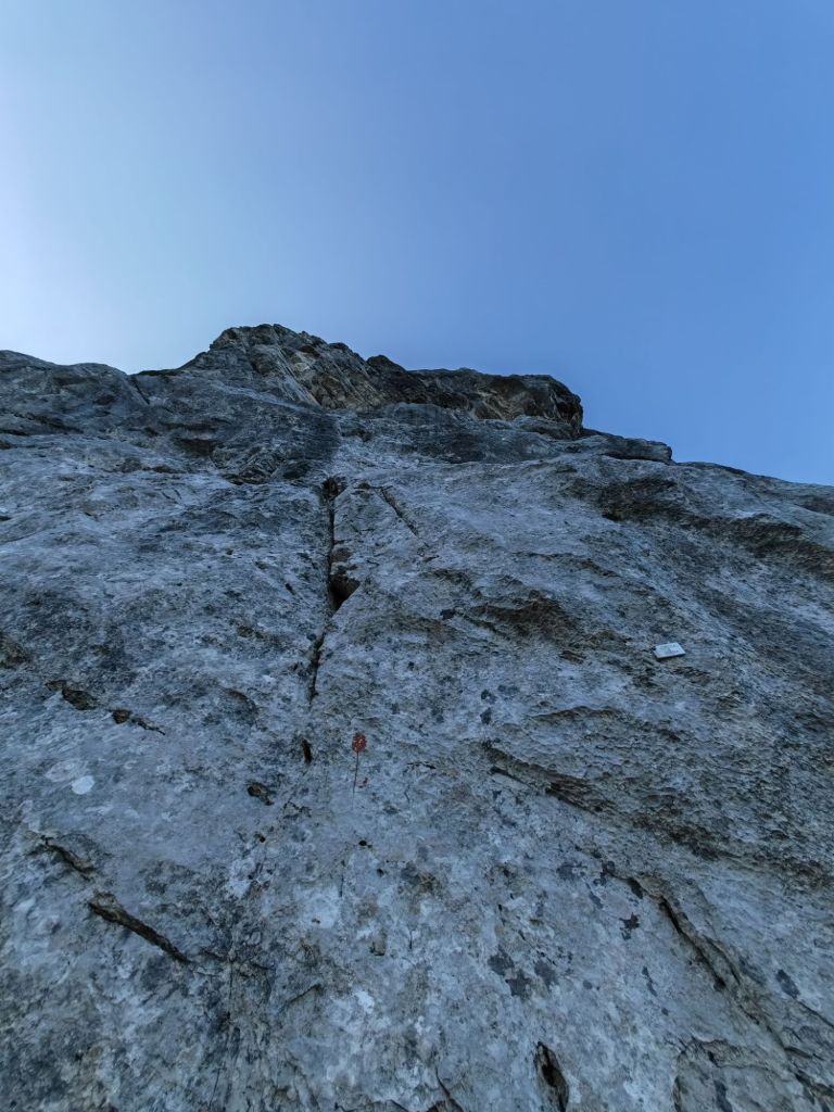 - Spostarsi qualche metro a destra sotto il tettino per poi rientrare a sinistra vincendolo nel punto di minor resistenza. Continuare dritti per placca più facile ma con roccia un po’ delicata fino alla grossa cengia dove si sosta su due fix. [6b, 20m]