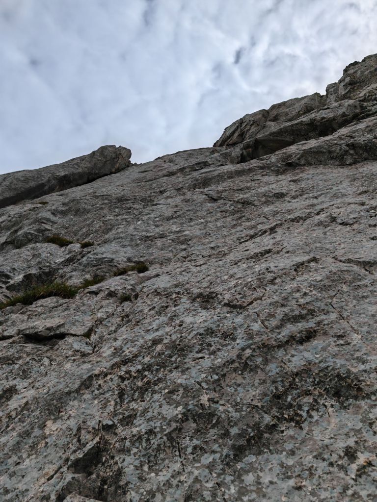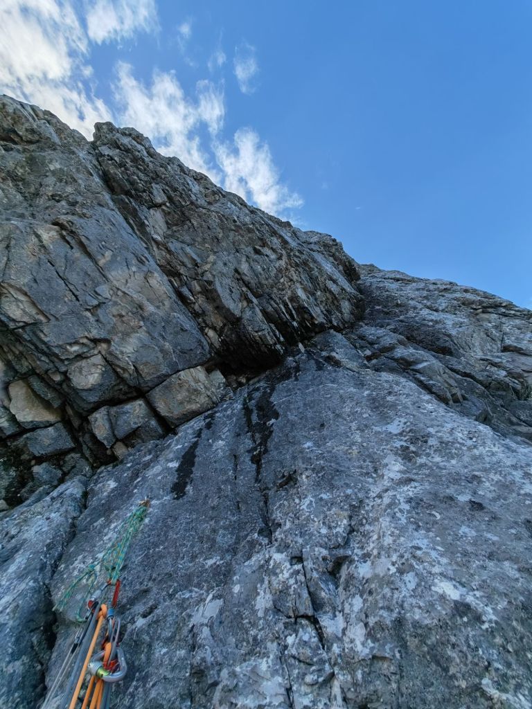 - Salire per 15/20 metri lo spigoletto sopra la sosta stando tendenzialmente a destra del filo fino a quando non conviene spostarsi a destra su terreno più facile e appoggiato. Continuare ora con percorso non obbligato dritti fino alla sosta su due fix. [IV, 35m]