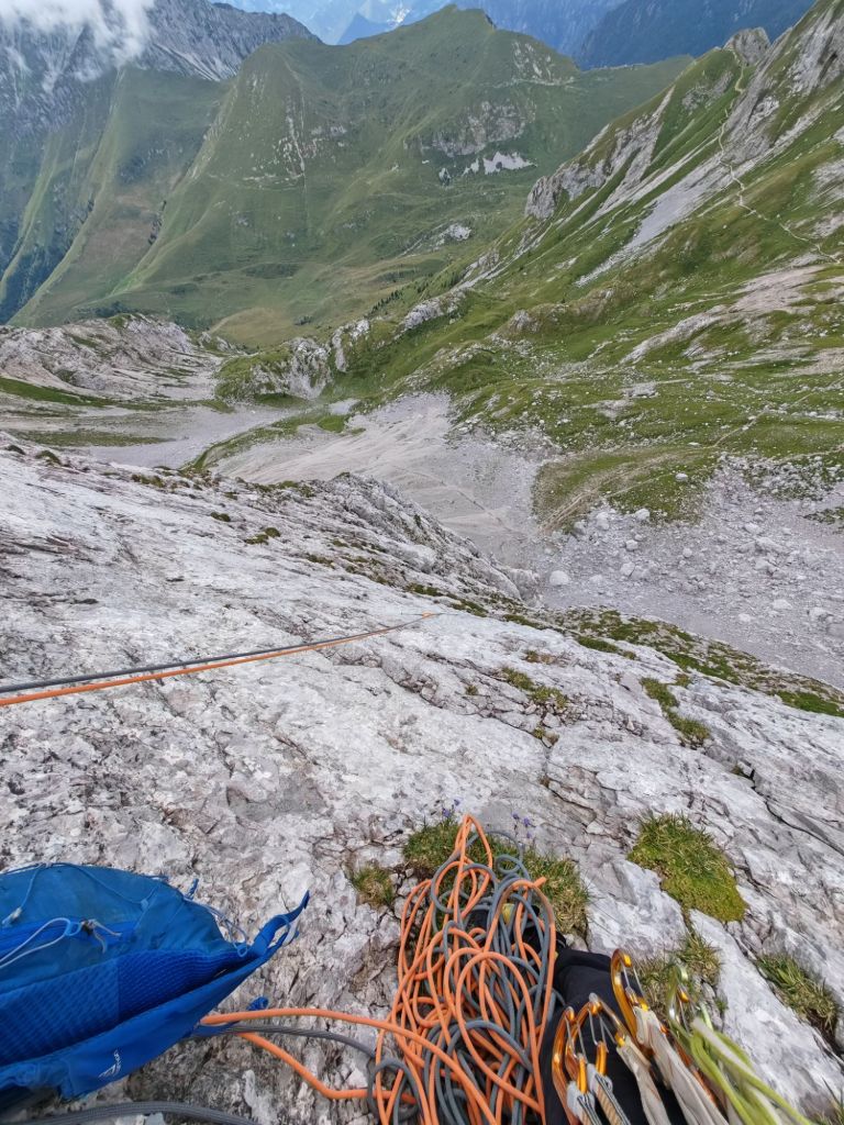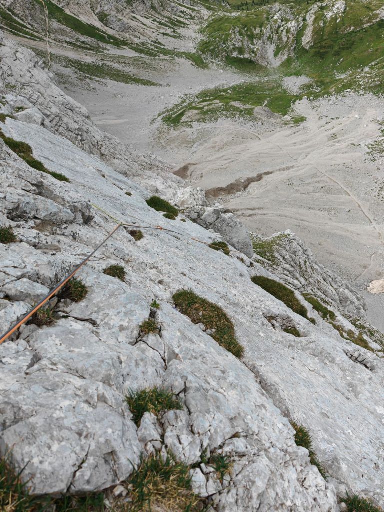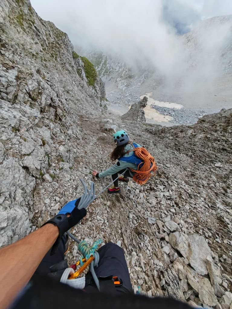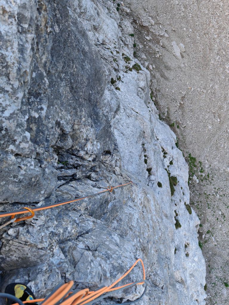 - Salire ancora per 35 metri elementari sopra la sosta stando leggermente a sinistra su spigoletto e poi spalla detritica fino a un golfaro singolo da cui si recupera il socio (fare molta attenzione ai detriti soprattutto con cordate sotto!).