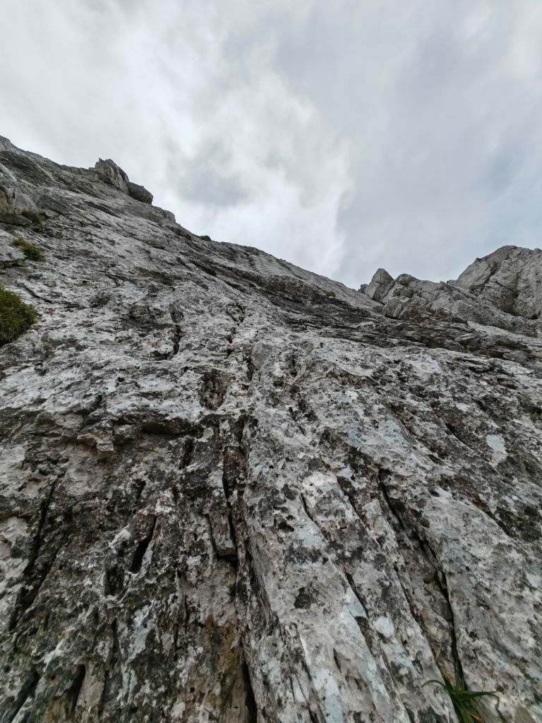 - Spostarsi un paio di metri a sinistra e risalire una zona articolata facile ma con alcuni blocchi instabili appoggiati a cui porre attenzione, continuare fino a un chiodo con cordone e poi progeuire per placche ora più impegnative (spit) che con qualche passo delicato portano alla sosta su due fix posta leggermente a sinistra su terrazzino alla base dell’ultima evidente placconata. [6a, 40m]